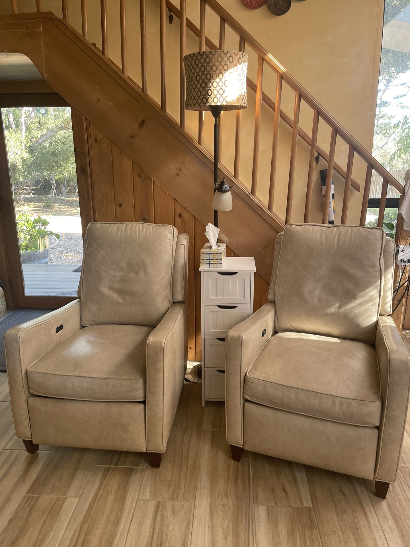 2 leather recliners for $225 each . Were purchased at $2,200 each . Off white color in very good leather condition.