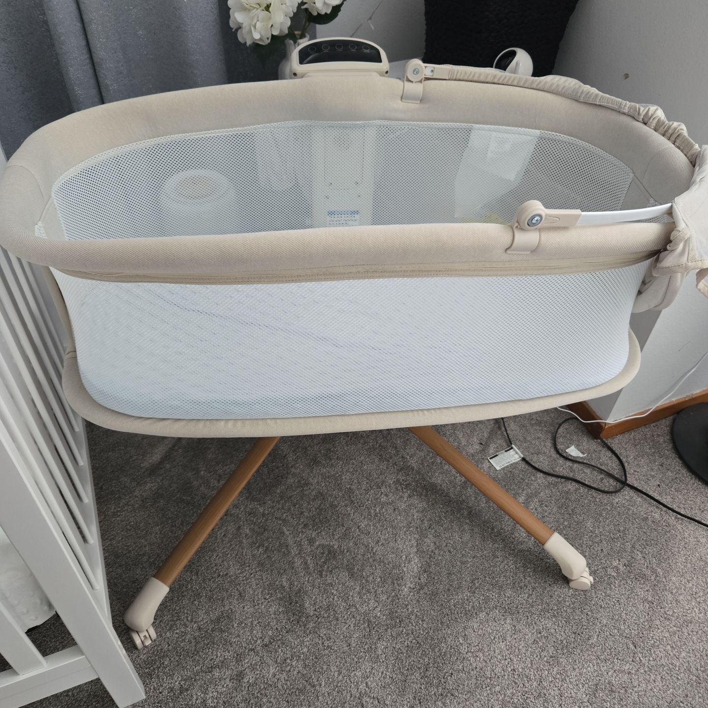Pick up west seattle Beige gliding bassinett Amazon 200$ Plays music Has wheels Used for 4 months And has hood that comes up for shade or play time Also come with 2 sheets Plug in wall