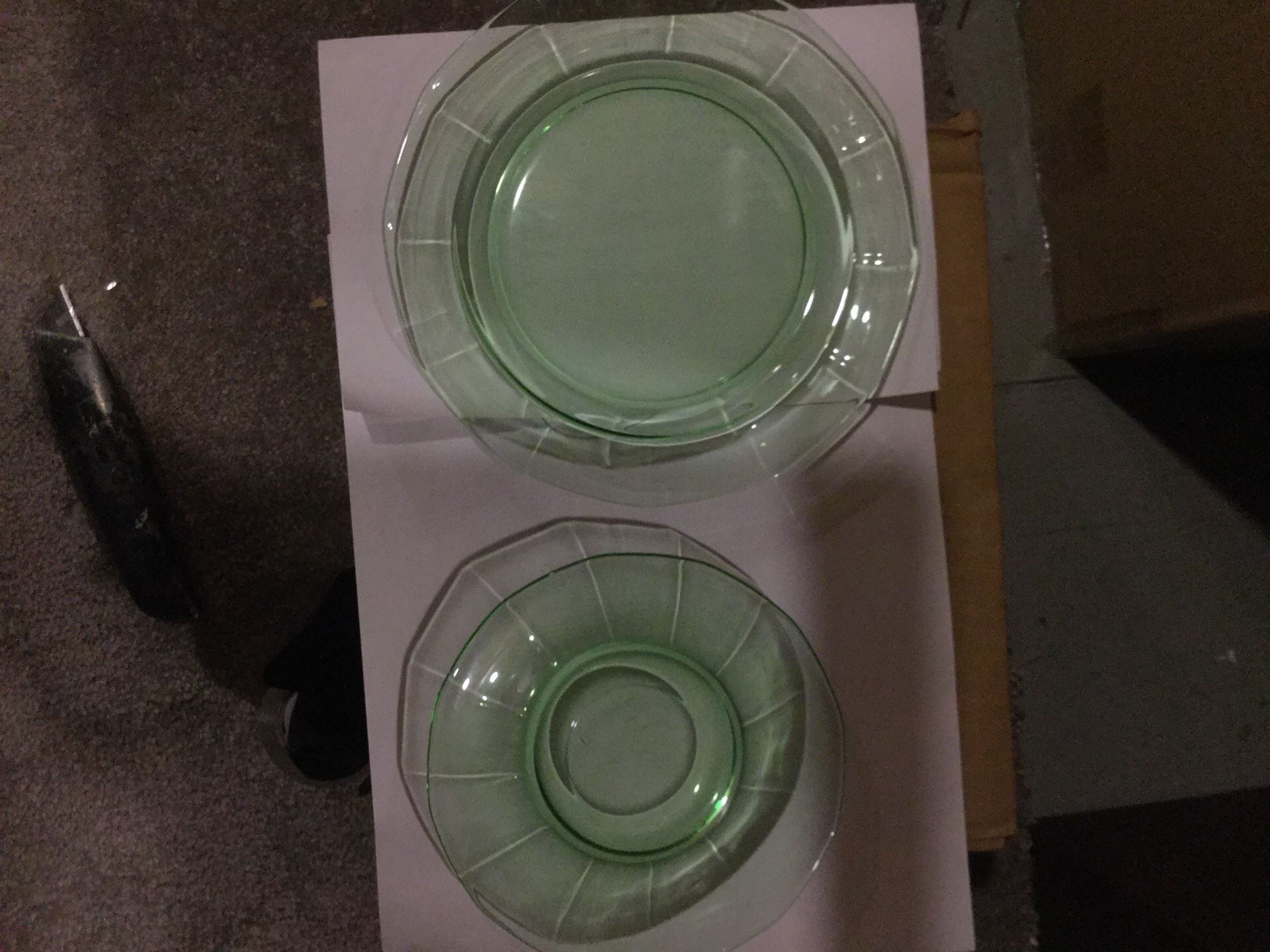 Fostoria Depression glass. Seven salad plates and 7 green cup saucers