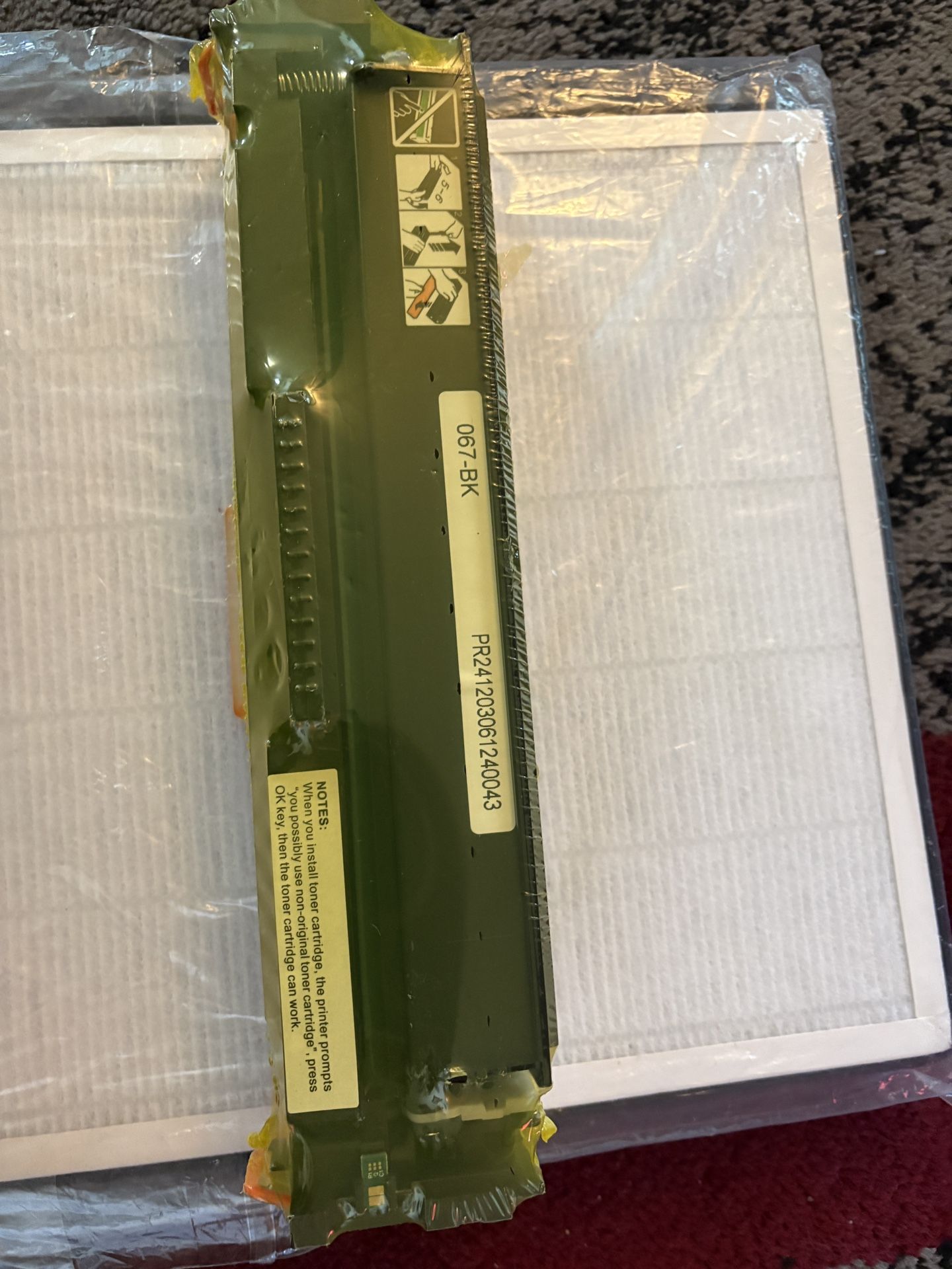 Color: Black. • Page Yield: It yields approximately 1,350 pages based on ISO/IEC 19798 standards. Compatible Printer: This cartridge is compatible with several Canon ImageCLASS laser printers, including models such as LBP632Cdw, LBP633Cdw, MF652Cdw, MF653Cdw, MF654Cdw, and MF656Cdw. • Installation Note: The cartridge notes indicate that if the printer prompts about using a non-original toner cartridge, pressing "OK" should allow the cartridge to function