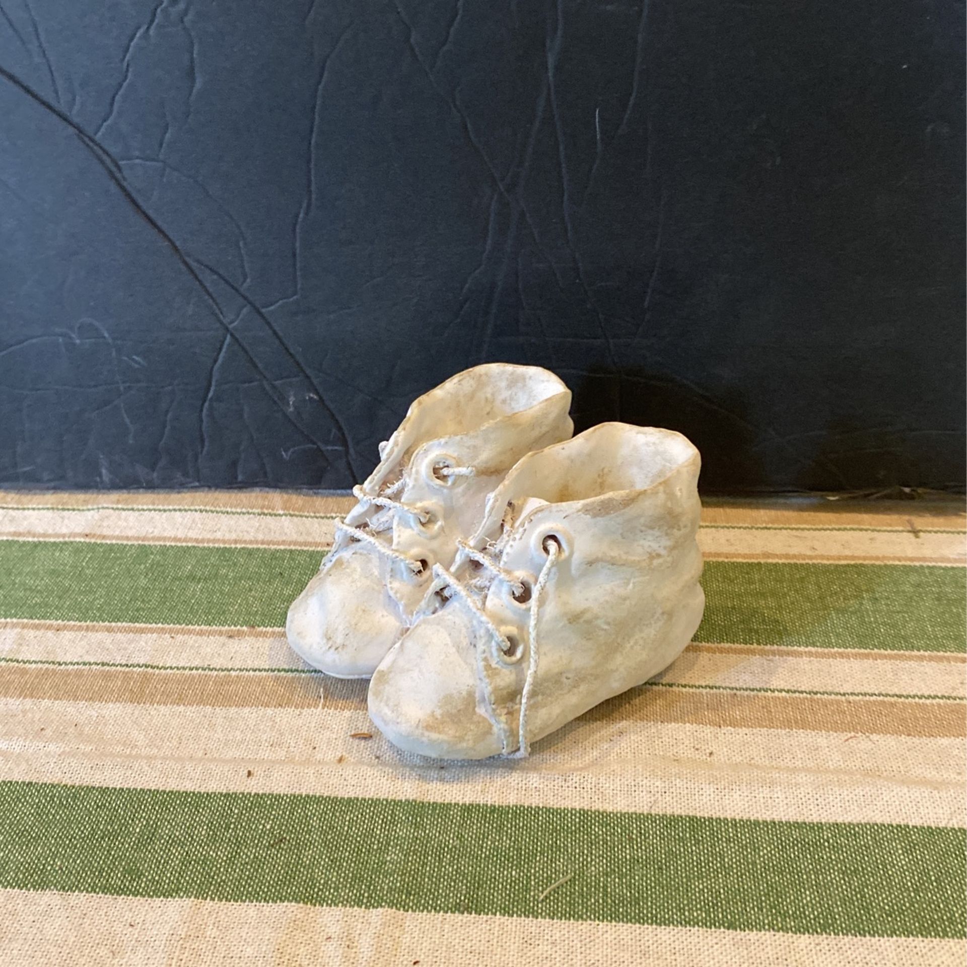 Small pair of baby shoes that are white washed and distressed. Measures 4”” long and 2.5” tall.