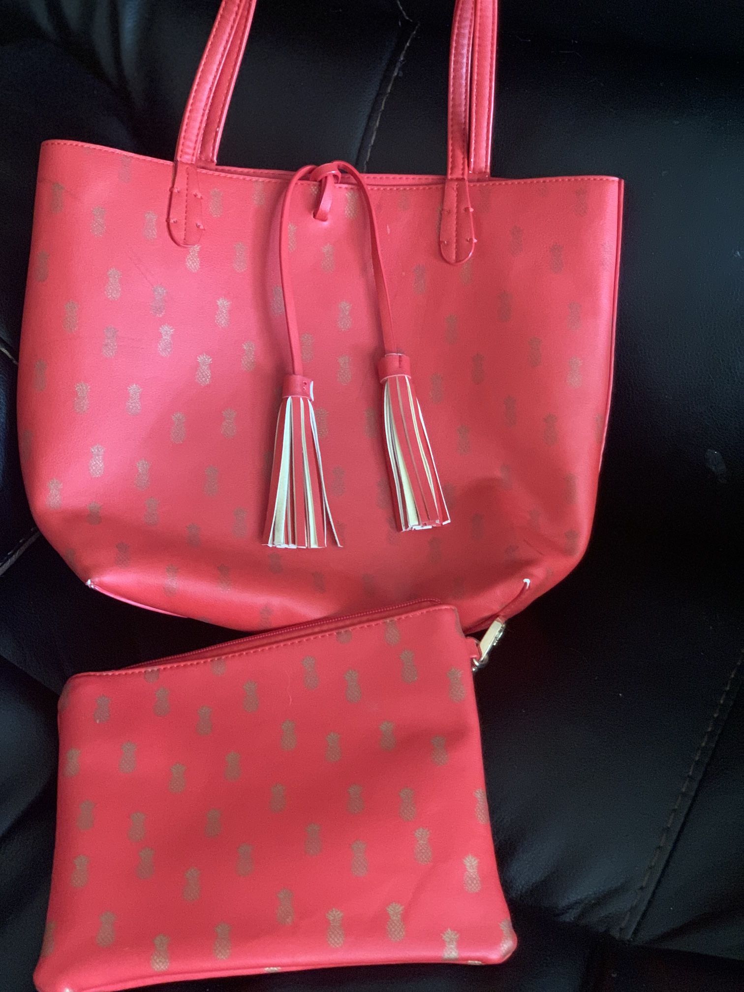 Red with gold pineapples on it see pics. On end of sone corner its white. See pics bag is in good condition.