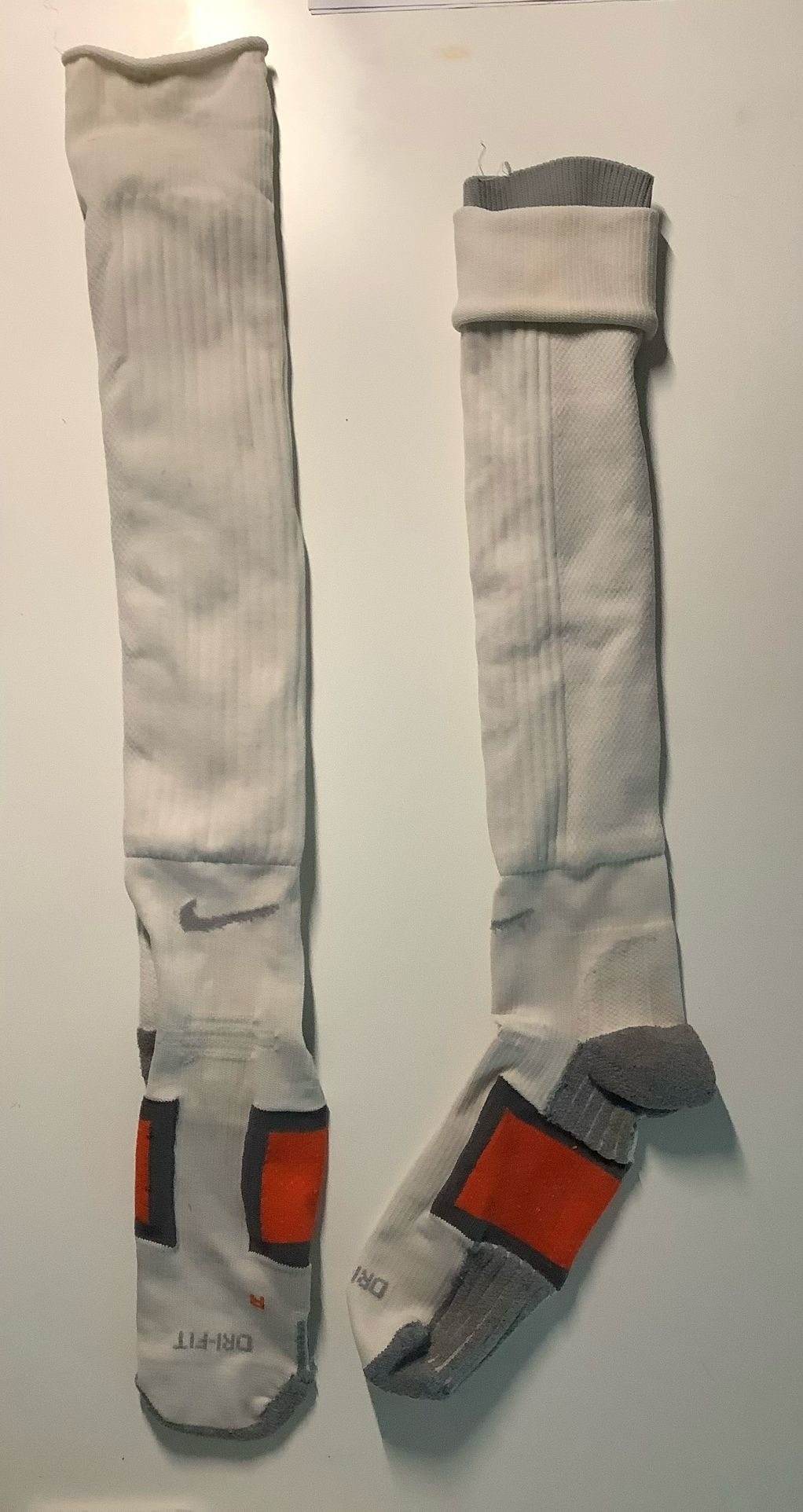 Long soccer socks; white with orange and gray at bottom; two layers, for shin guards; Nike dri-fit; lightly used