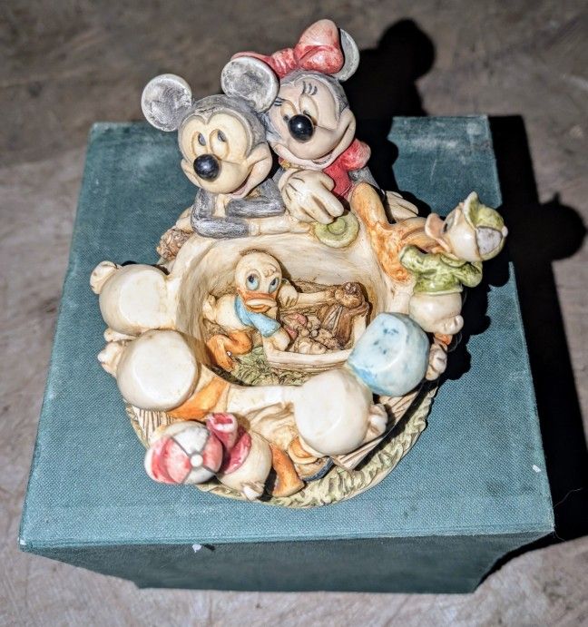 Harmony Kingdom family picnic with Mikey mouse and family including uncle scrooge, Minnie, Donald, nephew ducks, Pluto. Very rare piece to find In original box with Disney collection label of identification of the piece. Sold in 2001 at Walt Disney world park. Comes in two three pieces, two come together and the third piece is a little book accessory that does inside when it's put together for display. Found only two others online of the same exact item. So it's really a rare piece. Creator's signature is on bottom with the piece number and harmony kingdom label. Made in China. It's one out of 400 in the collectors set.