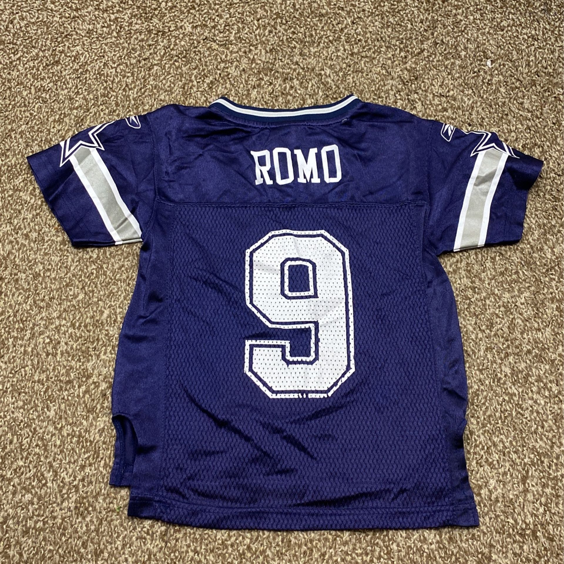 Vtg Reebok Tony Romo On Field Kids Jersey Size Small. Print screen on front is coming apart