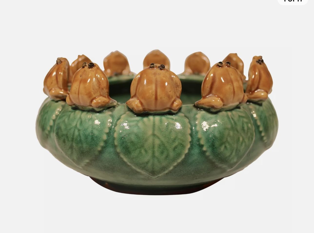 A superb antique English Majolica Green Planter with 12 sculptural frogs perched on the outer rim. This is such a lovely piece in excellent antique condition. There are no cracks or chips but there is crazing, commensurate with age. Details: DIMENSIONS 11.5ʺW × 11.5ʺD × 5.75ʺH STYLES English PERIOD Late 19th Century COUNTRY OF ORIGIN United Kingdom MATERIALS Ceramic COLOR Green CONDITION NOTES Excellent Antique Condition, no damage, signs of age