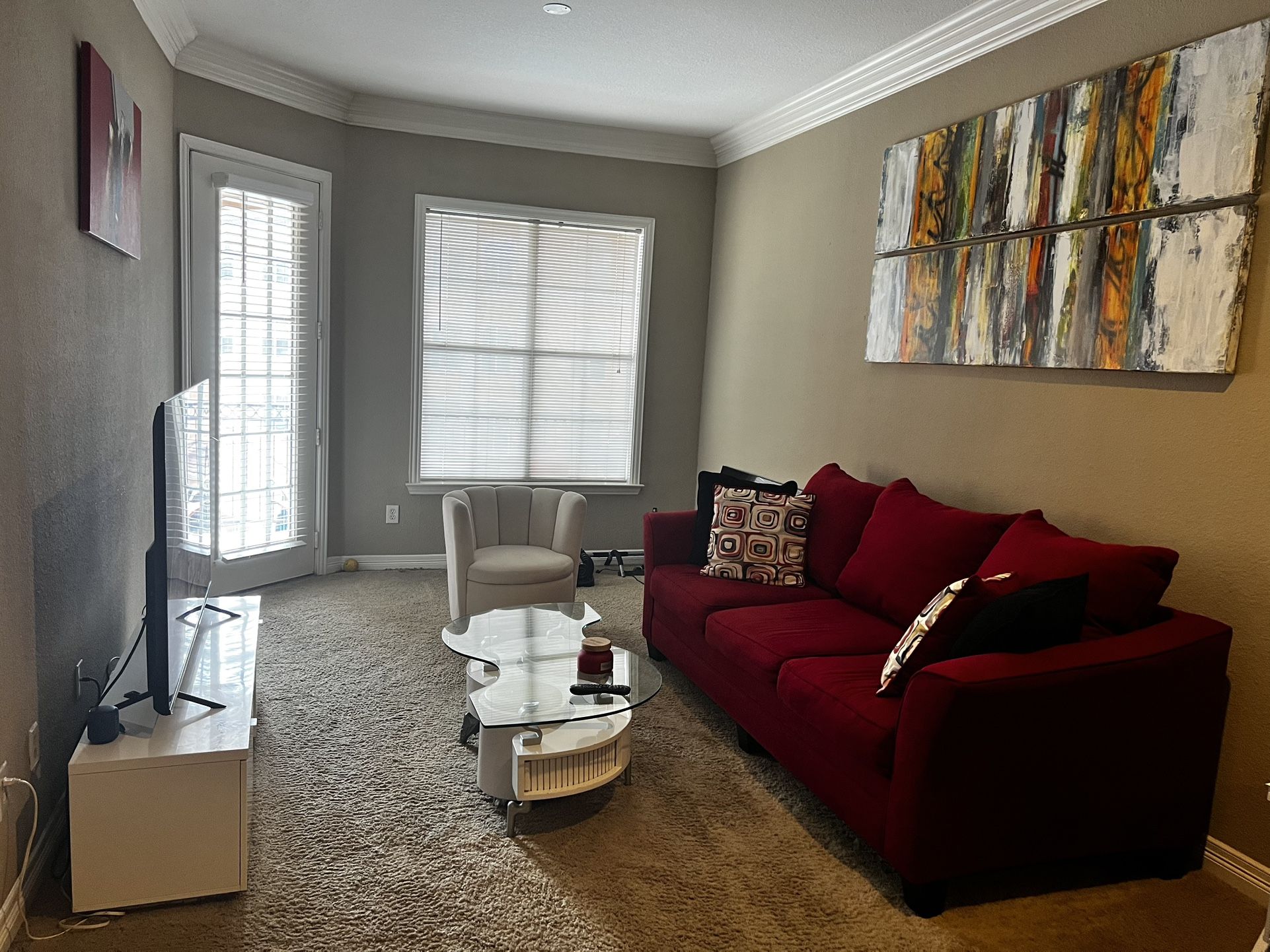 Moving sale!!! 8ft red couch with 4 pillows excellent condition. No holes tears or stains. Smoke free pet free home. All items in pictures are for sale individually or as a living room set. Also have a queen size bed frame & tv for sale. Must pickup from Galleria area. $600 obo (msg for pricing on whole set)