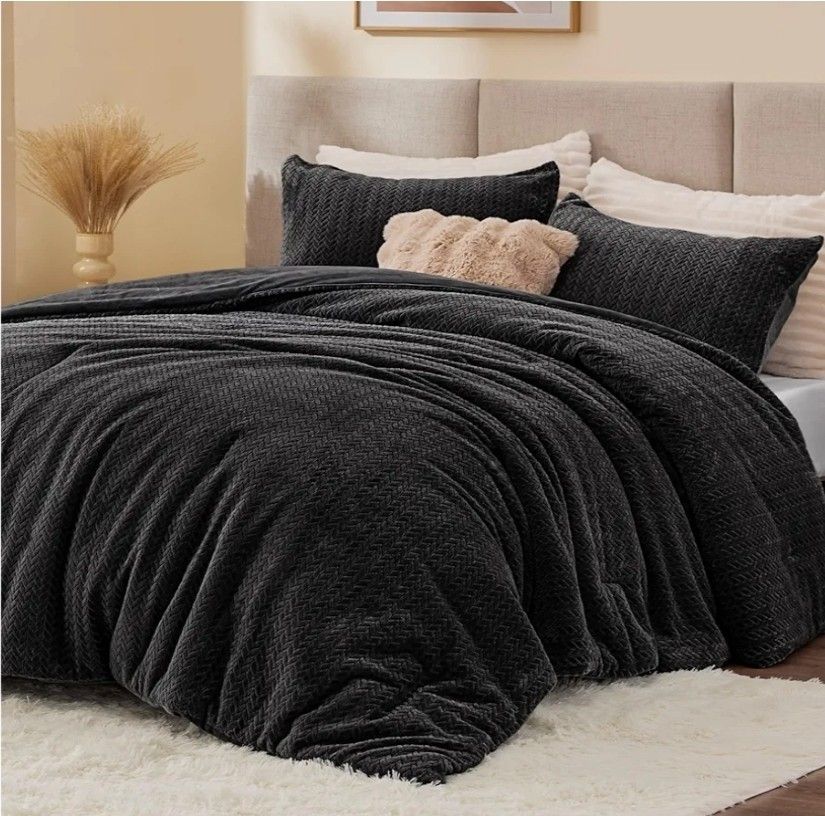 Fluffy Comforter King Set - Furry Black Leaves Pattern Faux Fur Bed Set, Winter Ultra Soft Fuzzy Comfort Set, Velvet Bedding Set for Bed with 2 Pillow Cases Brand new never used do not have original packaging