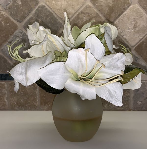Silk flowers in a glass vase with faux water remarkably realistic BRAND NEW 9 inches tall