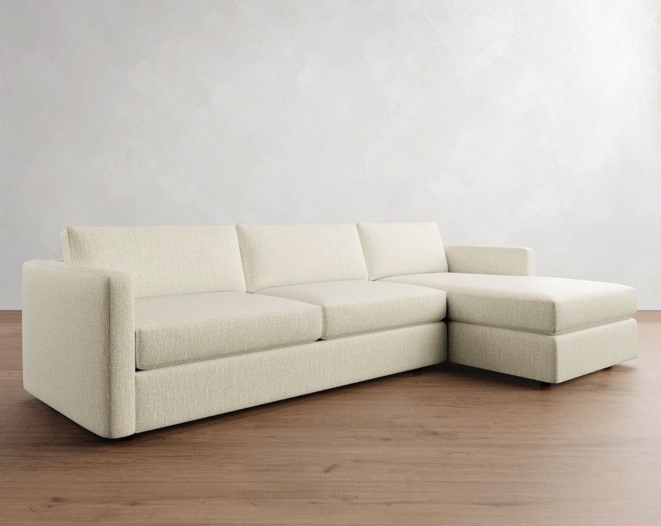Square Slim arm. • Removable, cylindrical, solid rubberwood legs are finished in Espresso. • Loose cushions; available in multi-seat or bench cushion. • Standard cushions have a down-blend-wrapped core for a softer feel and extra comfort. • Expertly crafted engineered wood frame with mortise-and-tenon joinery provides exceptional structural integrity. • No-sag steel, sinuous springs provide cushion support. • Adjustable levelers provide stability on uneven floors. • Hidden steel connectors hold modular pieces securely together. • Sectional includes: 1 Left or Right Loveseat or Sofa and 1 Left or Right Chaise. Chaise is available in Standard or Wide options. • Contract Grade: Thoughtfully designed and expertly engineered to meet rigorous testing standards and best practices from select ANSI/BIFMA testing protocols. • UL GREENGUARD Gold Certified. This low-emitting product has been screened for over 15,000 chemicals and VOCs to contribute to cleaner indoor air and keep you and your family safer.