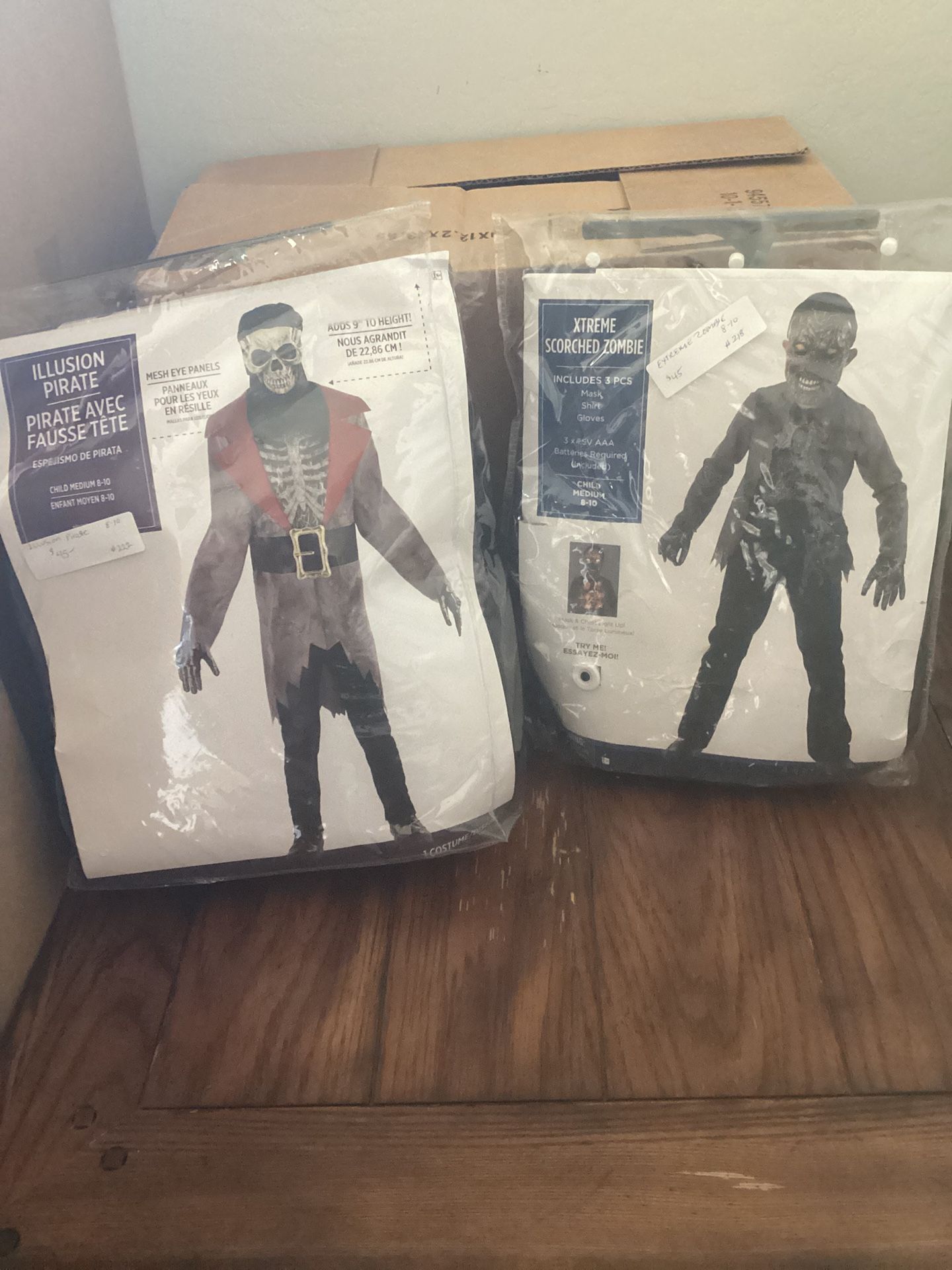 Brand New, super cool costumes. Dare to Be different. Extreme Scorched Zombie includes glowing mask, shirt and he screams. Also gloves to cover hands. Really cool costume. Scared me when I checked the batteries cause I wasn’t expecting the yell. Ever wanted to be real tall? I got you. Illusion Pirate got you covered. Comes with tall Jacket and creepy gloves. This is a winner. $45 each These costumes will be a hit no matter which one you choose. Worth every penny. Check my other listings here Thanks for looking! Halloween costume, Halloween, zombie, Pirate,