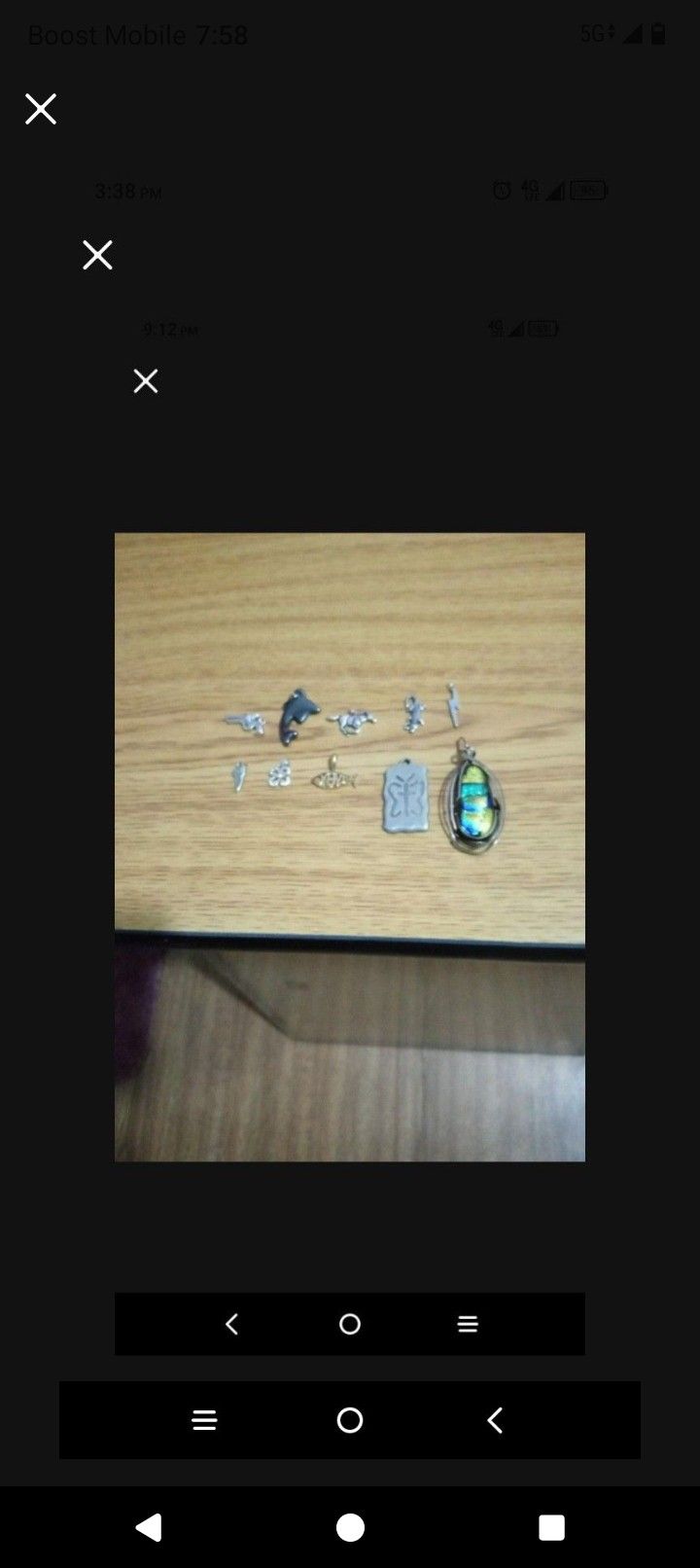 7 Charms & 2 Pendants Top Row , Dolphin, Horse, Gator, Bolt, Bottom Row Pepper, 4 Leaf Clover, Fish, Butterfly, all in good condition Buy the Ones You Want Must Pickup thank you have a good day