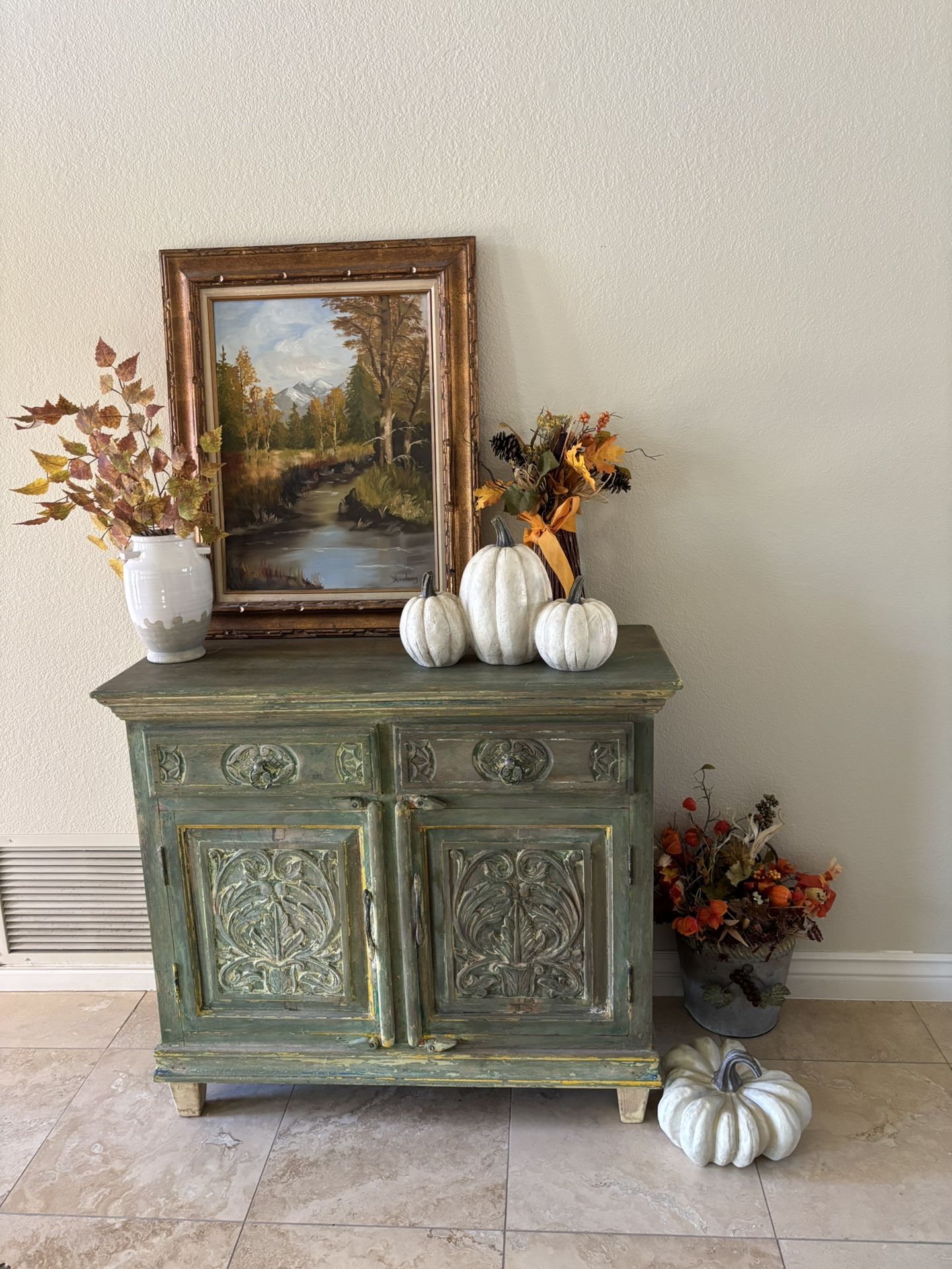 Ahwatukee Foothills 85048 Tall Fall Flowers Sticks - $5 Three White Pumpkins - $10 Pumpkin Crock - SOLD with Orange Flowers - $3 Large White Pumpkin - $10 Metal Container with Fall Flowers - $10 Painting 32” high x 26” wide- $50 White vase 7” wide x 10” high with faux leaves - $15