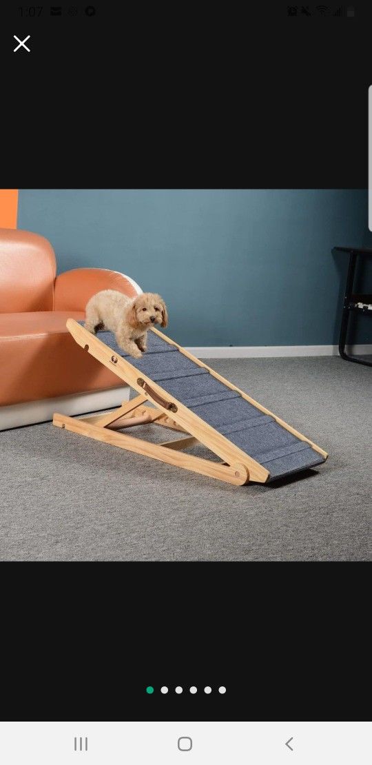 Adjustable Dog Cats Ramp, Folding Portable Wooden Pet Ramp for All Small and Older Animals - 42" Long and Adjustable from 14” to 26” - Rated for 200lbs - Lightweight Dog Car Ramps for SUV, Bed, Couch ADJUSTABLE HEIGHT: The foldable dog ramp can be adjusted to 6 heights -13.77, 17.71, 19.68, 21.65, 23.62 and 25.59 inches and it is very steady at all the settings. Versatile ramp helps your pets easily reach the car, bed, sofa and low furniture for easy home entry.The ramp is self-supporting and does not need to be placed on the car or furniture. SAFETY & STURDINESS: The length of heavy duty vehicle dog ramp is 41.33", width is 15.7", movable wood strip is 22", the size of the ramp is larger than the size of other products, durable stability solid wood construction and extra long movable wood strip offers strong support and that is not shakenWobbly. The sturdy ramps are independently safety tested and rated to support pets up to 200lb. HIGH TRACTION & NONSLIP: ALALACPY specially designed for the nonslip walking surface with multiple small wooden strips and provides a textured fabric carpet, and two wooden strips are nailed to its back to prevent the fabric carpet from lifting on both sides or even separating from the walking surface, which is perfect for small, medium, older pets or pets with mobility issues and relieve pressure on paws and joints, it’s a good gift for your pets. EASY TO STORE & CARRY: The antiSlip pet ramps fold down flat, Height is only 4.2", so you can easily removable it in your car, under your couch or bed without taking much space. The cat ramp weighs only 17 pounds and has a special carrying handle and