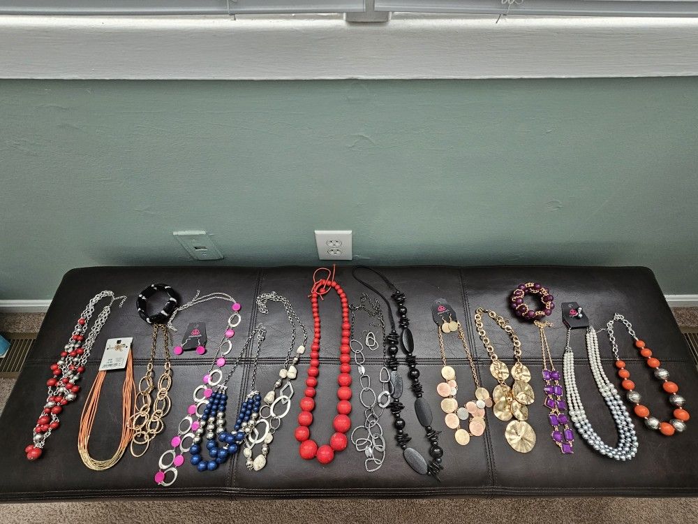 14 necklaces, 4 with matching ear rings and two wrist bracelets. Fashion jewelry never worn. Being sold all together