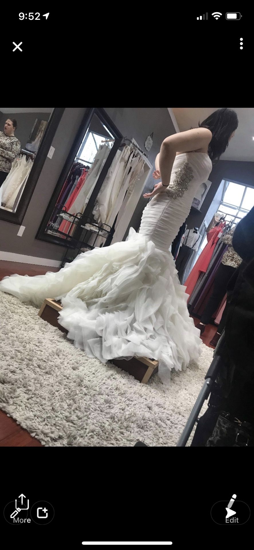 only worn once while trying on . I paid $980 asking $750. still has all tags on it and it has the cover ☺️
