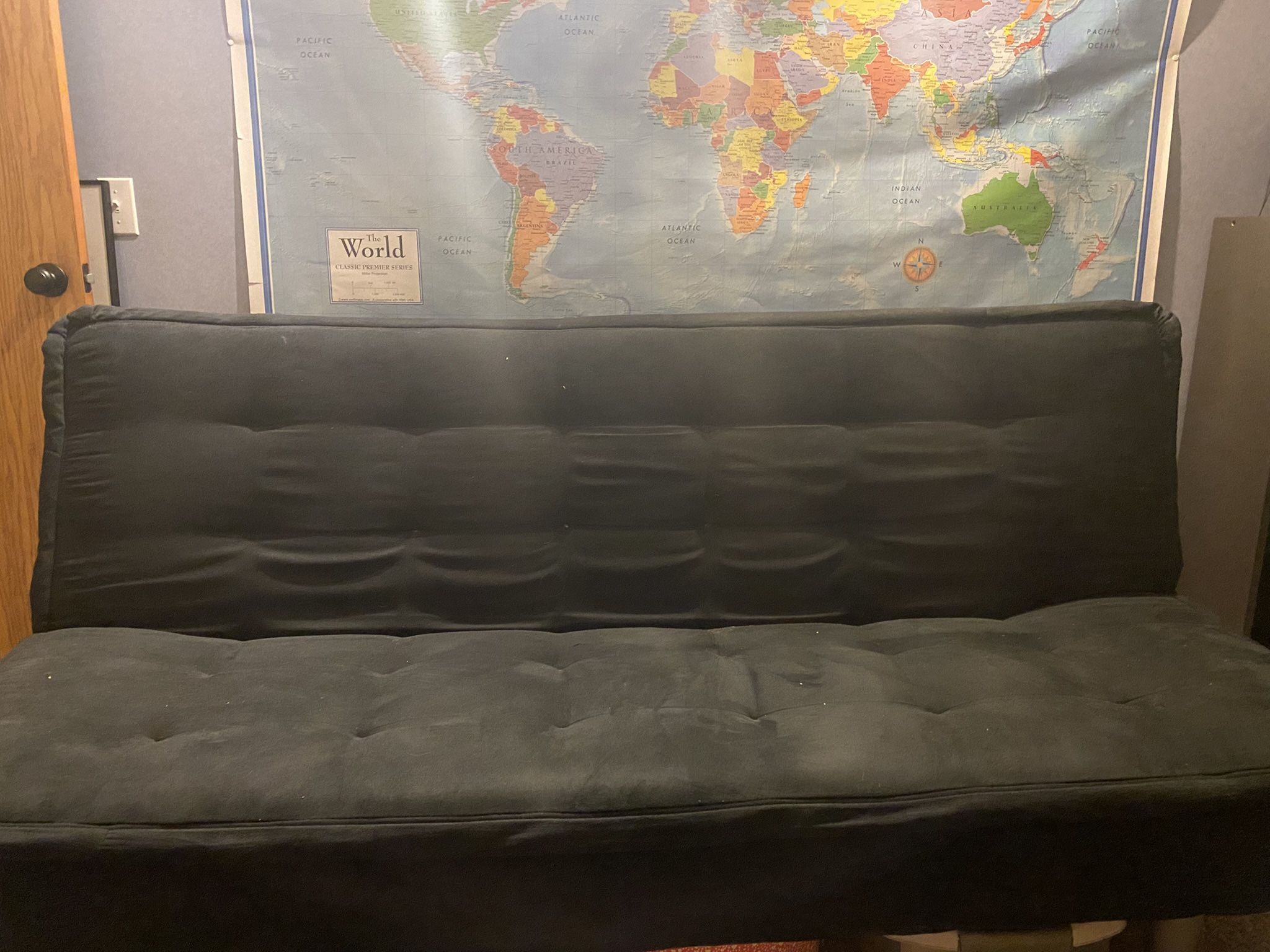 Black sofa bed in normal condition. No rips, tears or stains. It has a nice firm cushion and it is very easy to convert from bed to sofa. It also is to too large, so good for smaller spaces. It’s been a nice guest bed for us, but we need to downsize. Here are the dimensions. 35 inches (height) x 74 inches (length) x42 inches (width) Please reach out if you have any questions.