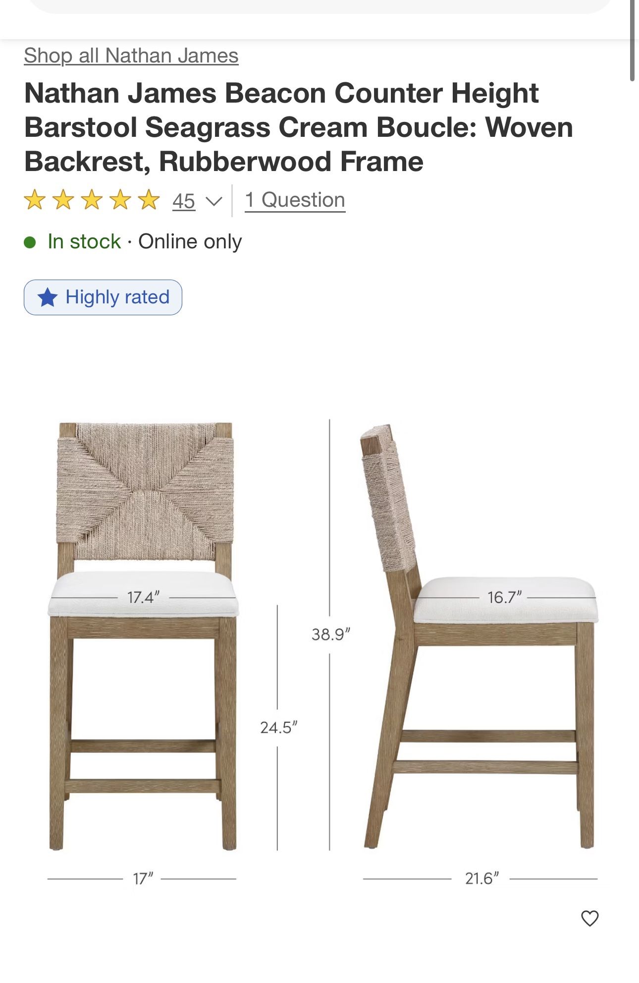 New in box. One bar stool. Counter height with woven backrest. Rubberwood frame. $100