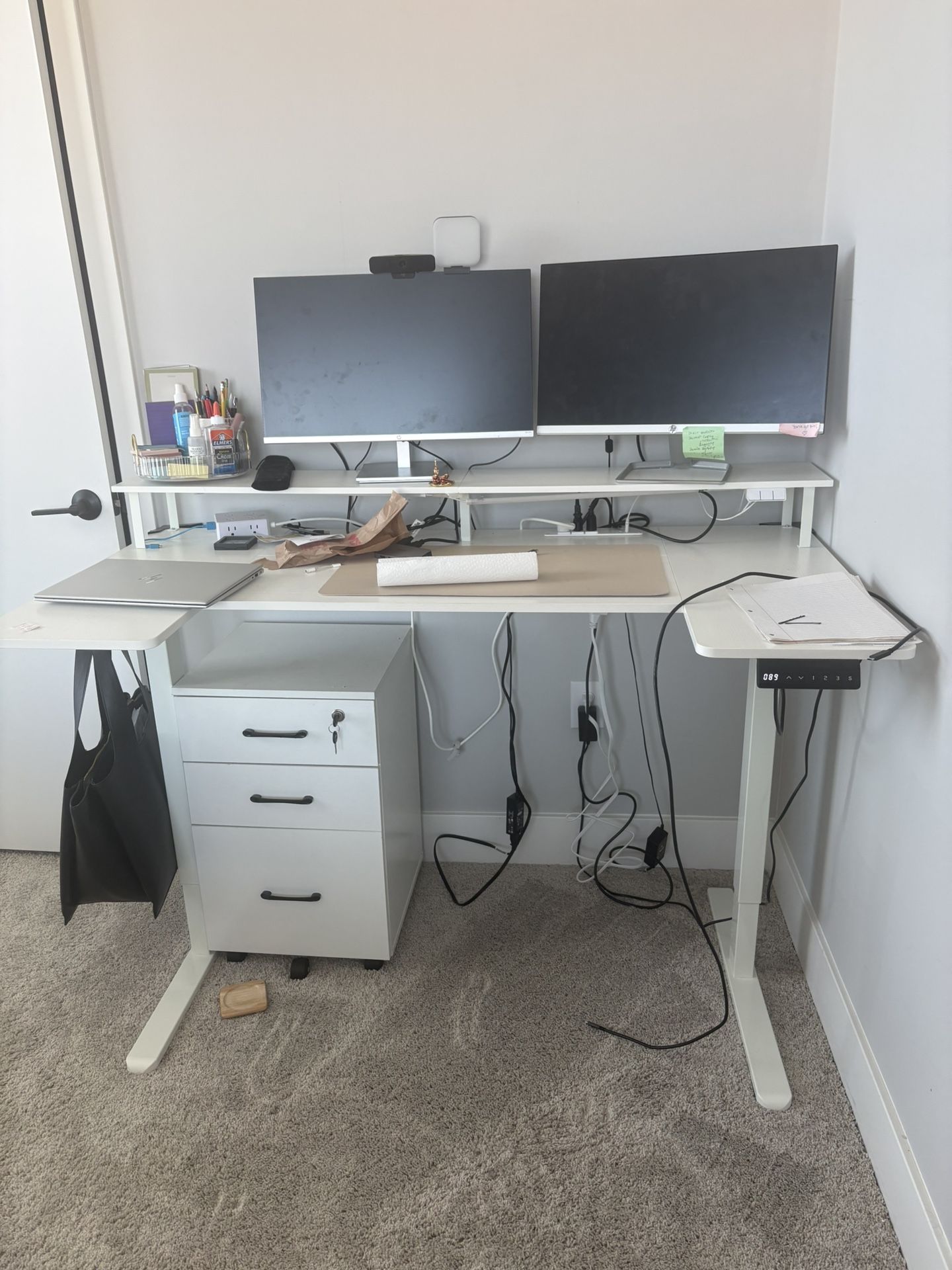 55 inch standing desk bought from Amazon in August. I’m selling it due to it being too big for my space . I bought the filing cabinet years ago , I’m selling it since I haven’t been using it . Able to be sold separately . Pick up only.