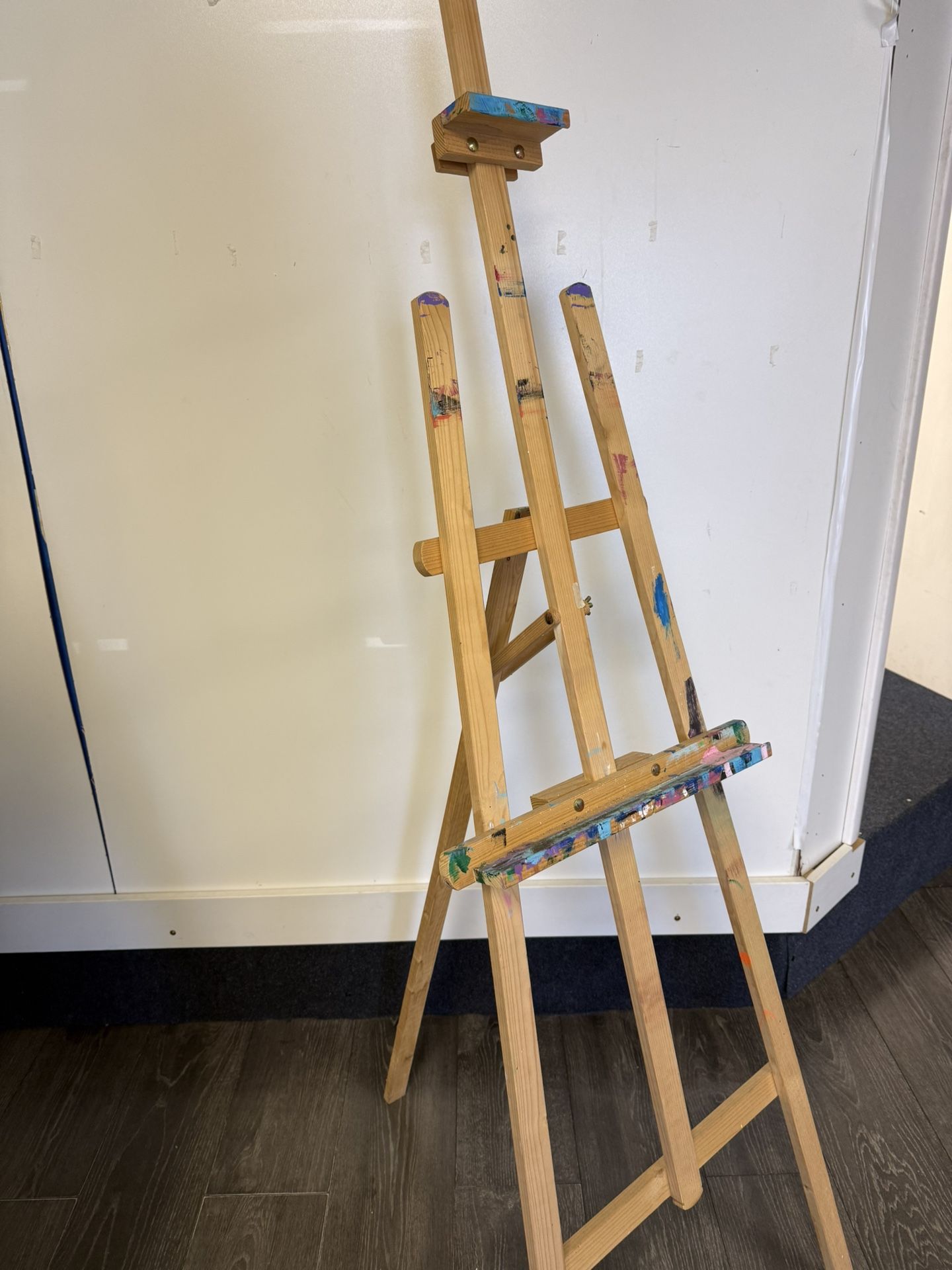 Wood stand. Big size. Works good Plus 3 new medium canvas