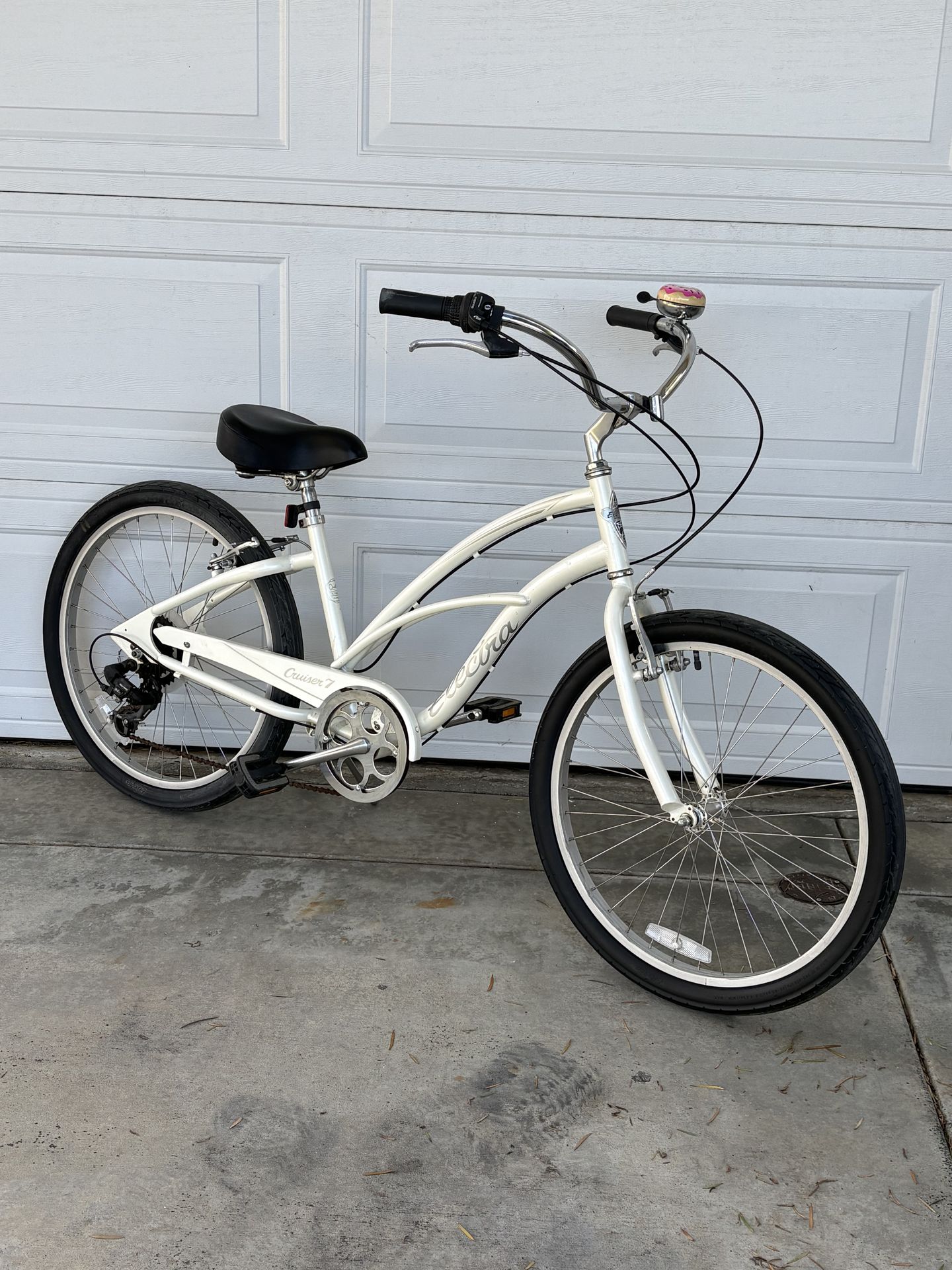Gorgeous 7 Speed Electra Cruiser 7 Beach Cruiser Bike - 24 inch wheels with front and rear hand brakes - 7 Speed Shimano Gears - Beautiful Shimmery Off-White Paint - Large Electra Gong Bell - Comfy Electra Wide seat - Smooth rolling Electra Tires - Fully Cleaned and ready to ride Bike looks great and rides silky smooth! Reach out with any questions