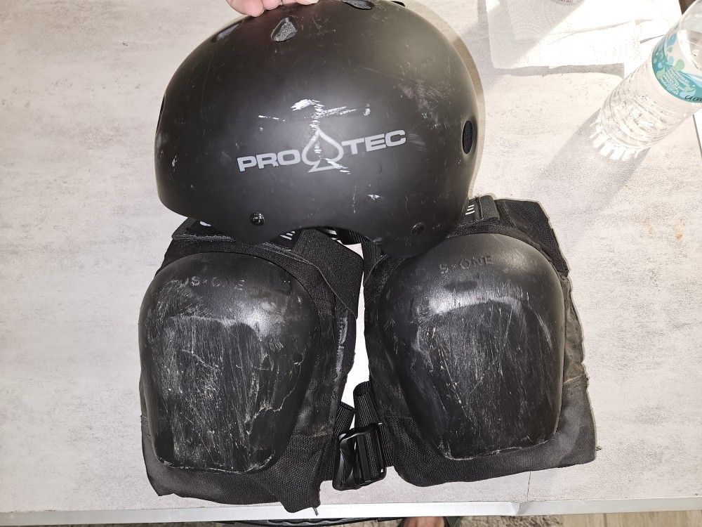 S one knee pads, and helmet ( medium), only used about 3 times on a wood ramp. Don't need them anymore. Helmet plus pads all in good shape.