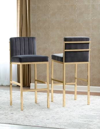 $215 Per Chair- (Must by in packs of 2)- Counter Height available: $199 Each This handsome two-tone counter height stool offers warmth with a touch of glam. Charcoal velvet material thickly cushioned for comfort. Stylish rose gold legs offer lustrous accents. Width: 17.75 in Depth: 20.75 in Height: 40 in. Counter Height- Width: 17.75 in Depth: 20.75 in Height: 34.75 in