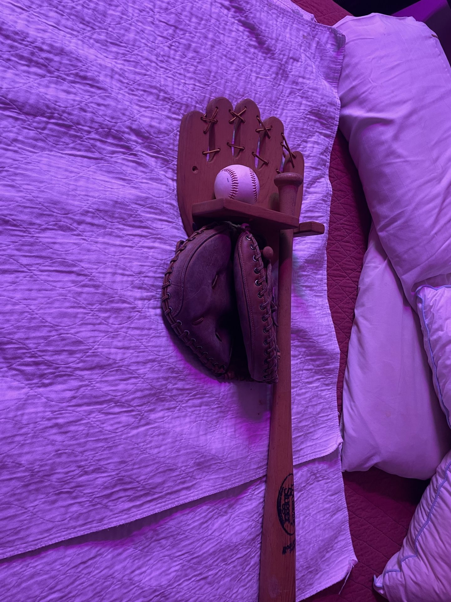 See pics mont on wall holds glove ball an bat kids like it hanging in there rm