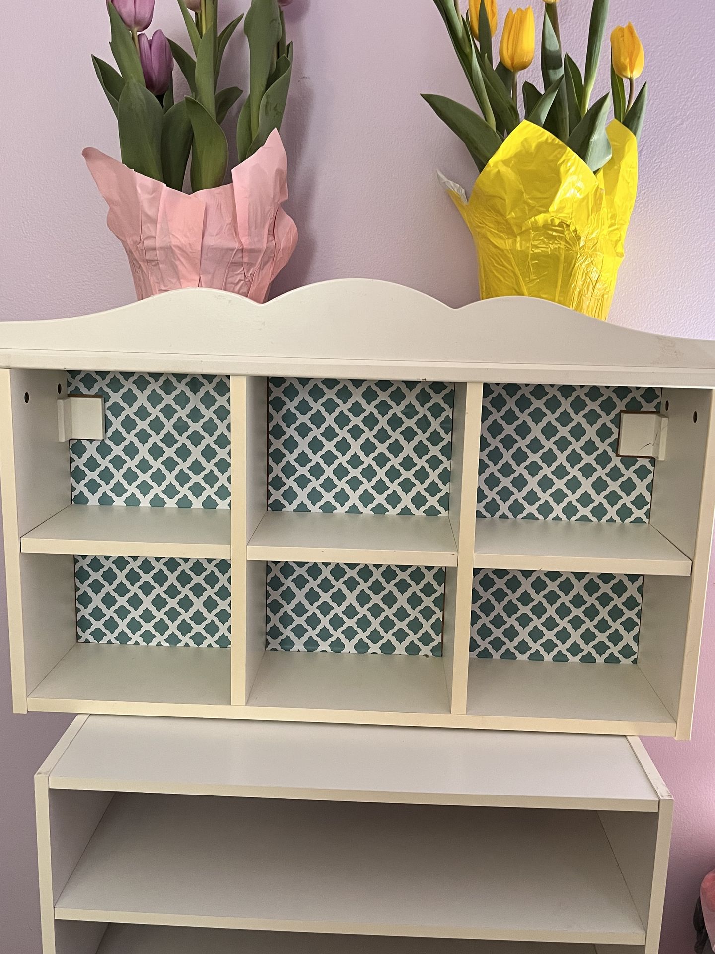 Ikea white wood wall shelf organizer 29” wide 19” height 6.5” deep The insert color is removal if you want to change the color Great for collectibles, teacups and perfumes