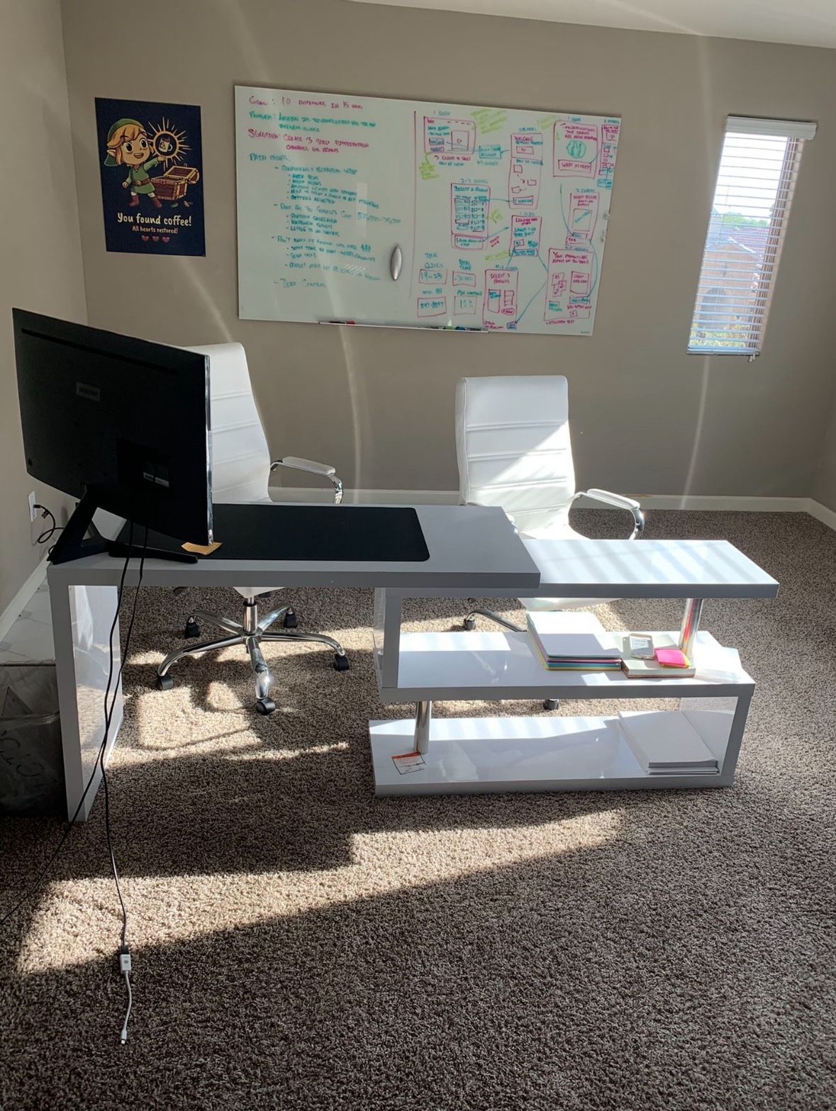 Honestly you have no idea how nice this desk is, if you love putting up your feet the S curve is perfectly level for your feet and I will sell the chair with it! Also expands out into a straight line to make a separate desk if you have an assistant or friend over. Desk was $1,400 new and chair was $600. I can not deliver it, you have to pick it up. This isn’t ikea cheap, it’s genuinely really nice and glossy and can have glasses put on it without staining. Will not accept low ball offers. Kept in like new great condition! (REMINDER : PRICE INCLUDES WHITE LEATHER CHAIR ) First come first serve!