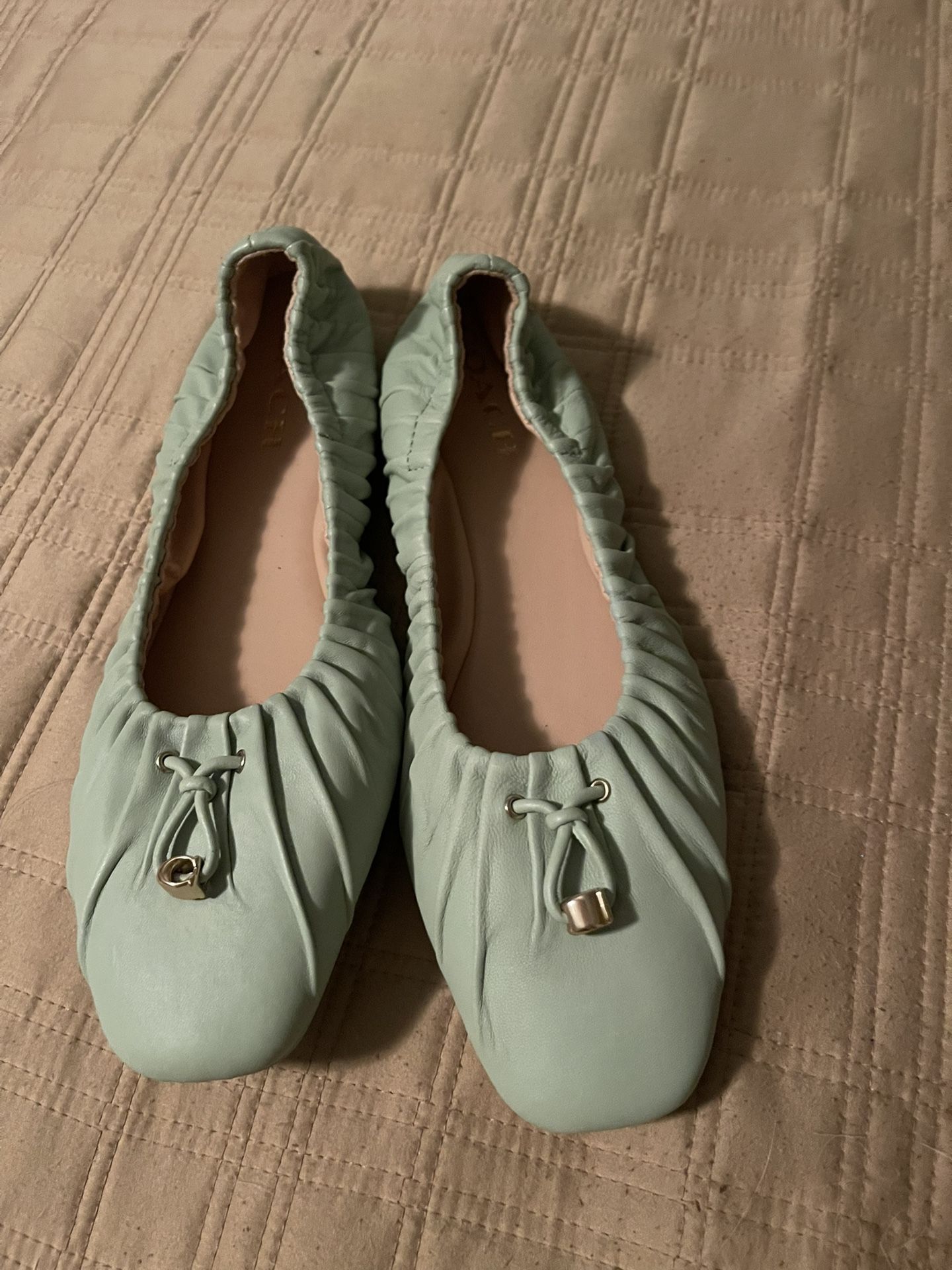 Soft mint green leather ballet flats by Coach. Beautifully ruched with elastic trim for a custom, comfortable fit. Finished with silver-tone drawstring accents. Lightly worn and in excellent condition. A fresh, elegant touch for any look. Size 8