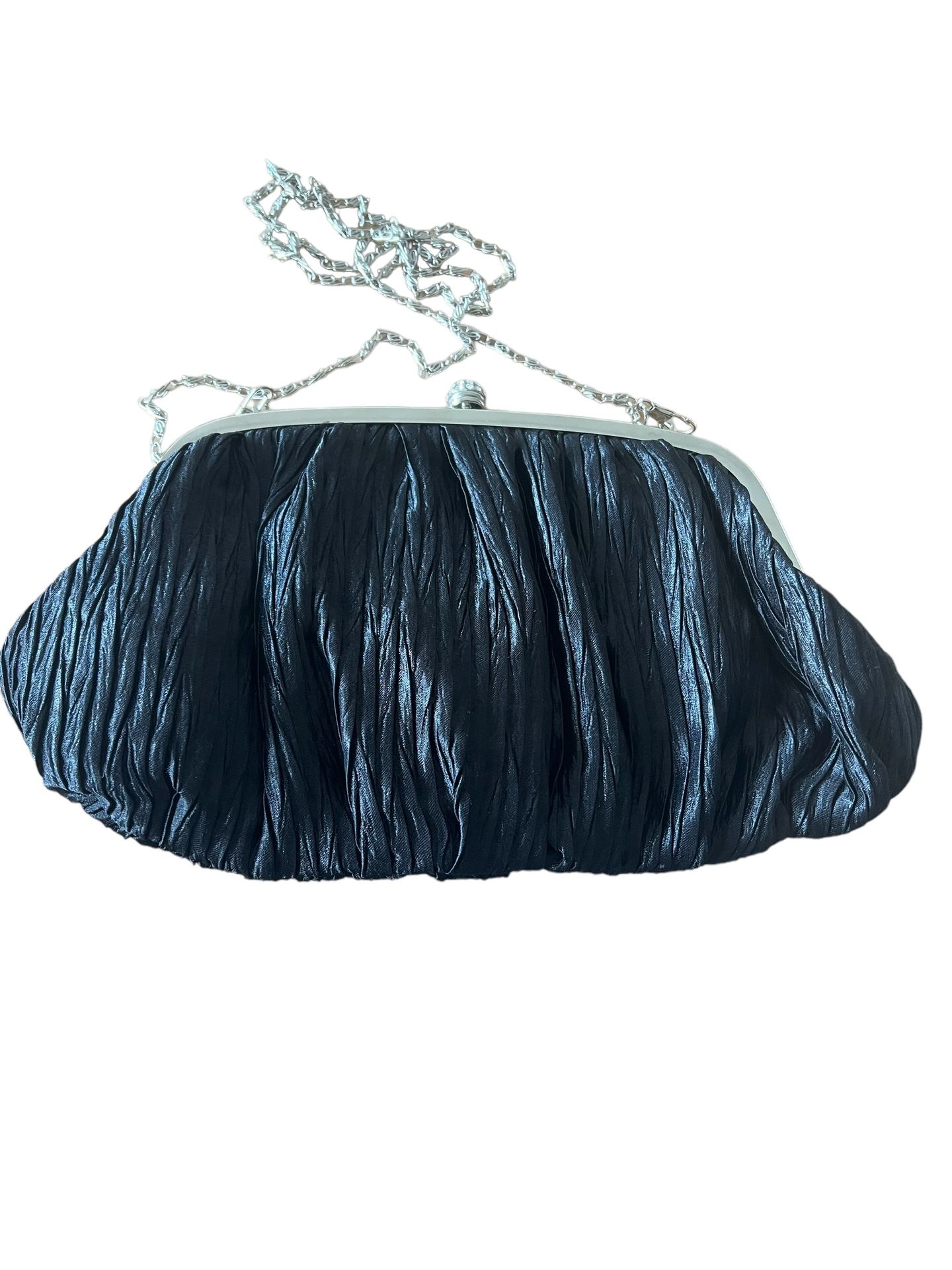 Neiman Marcus Black Clutch Evening Bag With Rhinestones And Detatachable Chain Add a touch of glamour to your evening look with this stunning Neiman Marcus black clutch. The bag features a beautiful rhinestone accent, and a detachable chain strap that allows you to wear it as a crossbody or shoulder bag. The satin exterior is complemented by a sleek metal handle that comes in a silver color, while the interior lining is made of black satin. This clutch is a perfect accessory for formal events such as weddings and parties, and its small size makes it convenient to carry around. The bag is pre-owned and has a vintage feel to it, adding to its unique style. It's a must-have for any fashion-forward woman who wants to make a statement. B84