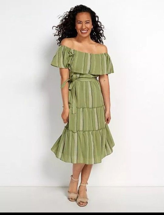 NEW Isaac Mizrahi Women's Convertible Tiered Striped Woven Dress Rosemary SZ 12. Olive Green. You can wear on or off your shoulders. The dress has a lining, SEE PICTURES The 1st 2 pictures are stock.