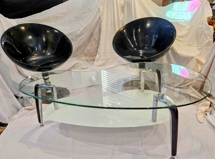Vintage Mid-Century Modern 3-Piece Set: Fiberglass, Chrome & Glass A highly desirable and complete vintage set from the Mid-Century Modern (MCM) era (likely 1960s). This set is defined by its iconic design: an Atomic Age two-tiered glass coffee table paired with two stylish black molded fiberglass swivel chairs. Perfect for any collector or modern interior. Set Includes: 1 Two-Tier Kidney-Shaped Coffee Table 2 Black Molded Fiberglass Tulip-Style Chairs Key Features & Style: Chairs: Authentic molded fiberglass shells (non-upholstered) on chrome pedestal bases with 360-degree swivel functionality. Table: Features a clear glass upper level and an opaque/frosted lower level. Condition Details: The coffee table glass is in excellent vintage condition with no chips. The chrome base has minor surface rust/patina consistent with age, but this is not extensive. The fiberglass chairs are structurally sound. NOTE: The chrome pedestal bases on the chairs show visible rust/patina and will require cleaning/restoration to reach maximum value. Approximate Dimensions (Must be verified by buyer): Table: Min Width: 18.5" Max Width: 31.5" Length: 53" Height: 16.5" Chairs: Width: 25.5" Height: 29" Asking $1499 obo. Local pickup in Costa Mesa