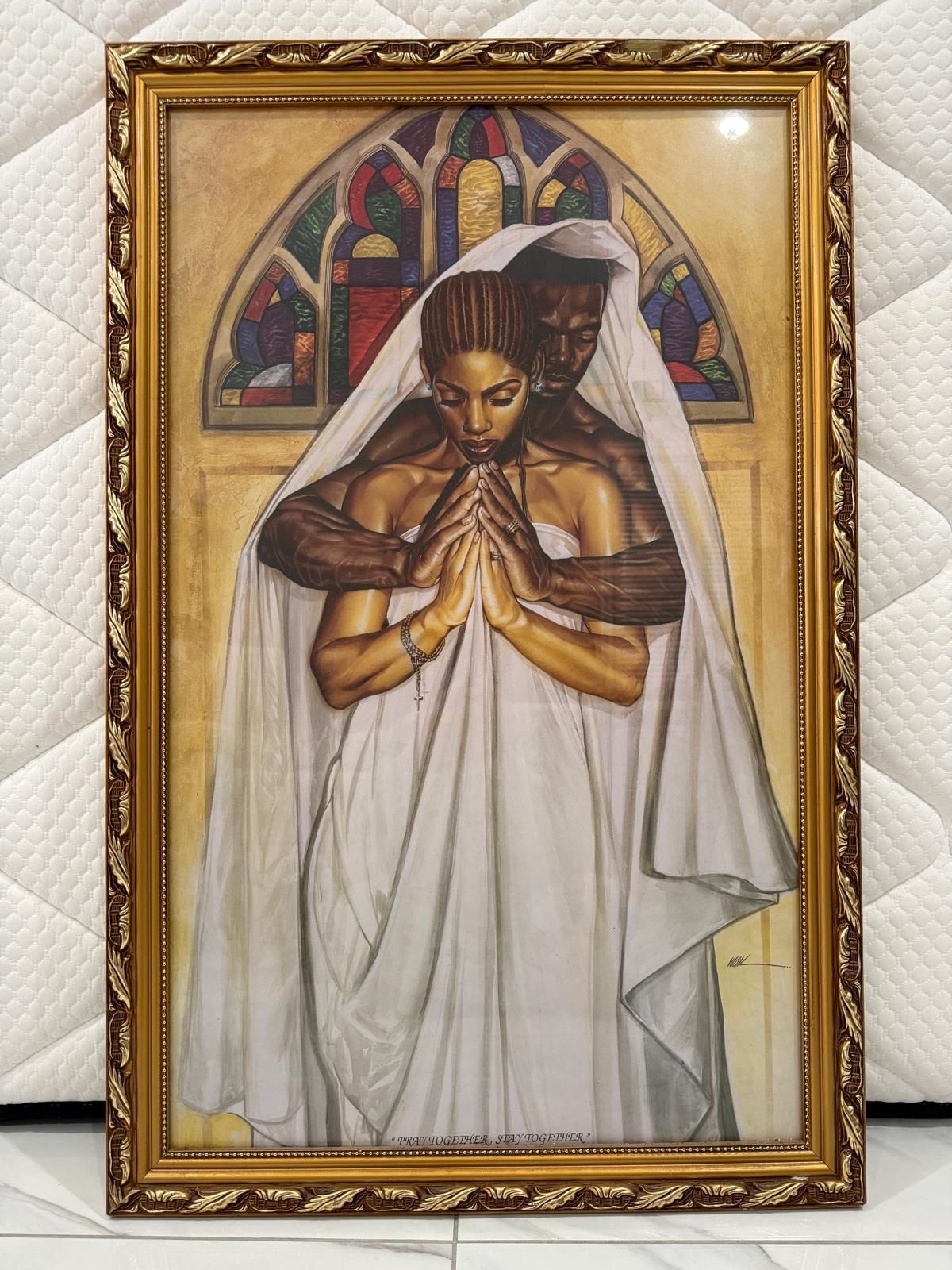 La pintura es una litografía de Kevin "WAK" Williams, un artista destacado en el arte afroamericano contemporáneo. La imagen muestra a una pareja envuelta en mantos blancos con las manos juntas en oración, simbolizando la fuerza espiritual dentro de una relación. Es una pieza popular que a menudo se regala en bodas o se utiliza como decoración espiritual en el hogar. The painting is a lithograph by Kevin "WAK" Williams, a prominent artist in contemporary African-American art. The image shows a couple wrapped in white cloaks with their hands together in prayer, symbolizing spiritual strength within a relationship. It is a popular piece that is often given away at weddings or used as a spiritual decoration at home.