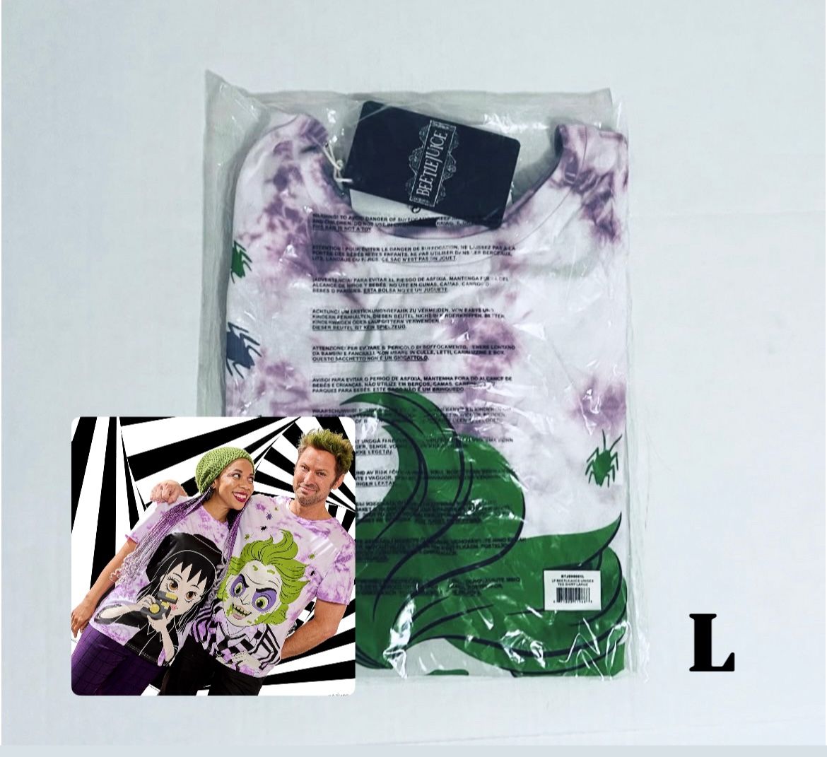 Brand New with Tags in original shipping plastic Loungefly Beetlejuice & Lydia Deetz Tie-Dye T-Shirt in Unisex Size L! Crawling with wickedly fun vibes, our Beetlejuice Tee Shirt is ready for showtime! This screen-printed shirt features Beetlejuice on the front and Lydia Deetz on the back, wearing her witch hat and holding her camera. Or, since this tee shirt is also reversible, you can mix things up by wearing Lydia Deetz on the front and Beetlejuice on the back. Tie-dye-like splashes of color carry around from front to back, and you'll even spot a few bugs making their way over the shoulders on both sides. This cool and comfy tee is perfect for visiting your favorite haunts in style.
