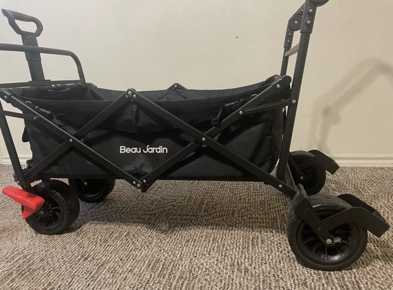 BEAU JARDIN - Folding Beach Wagon with Double Brake, Black BEAU JARDIN - Folding Beach Wagon with Double Brake, Black. The BEAU JARDIN folding wagon with free standing function.The back wheel comes with 2 supports that can make the cart free standing. The front wheels with two brakes, which can make the wagon brake even on the slope. The folding wagons cart fabric material 600D Polyester, and it is removable for easy hand or hose washing, camping wagon cart frame material steel, the outdoor utility wagon cart sturdy black steel frame is more stable. It opens and folds up easily in seconds. Folding away for convenient storage. Small enough to fit in closet, on the wall or in the trunk of any standard car.