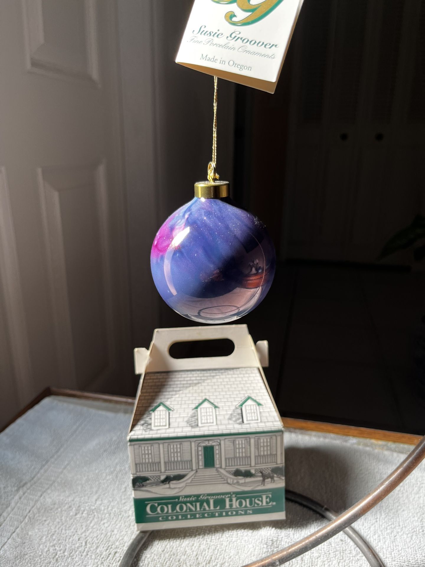 Porcelain Christmas ornament with beautiful swirls of blue, pink, purple. A Susie Grover Collectible, Colonial House Collection 1998. Designed and hand painted in Stafford, Oregon. Has original tag and box. $10