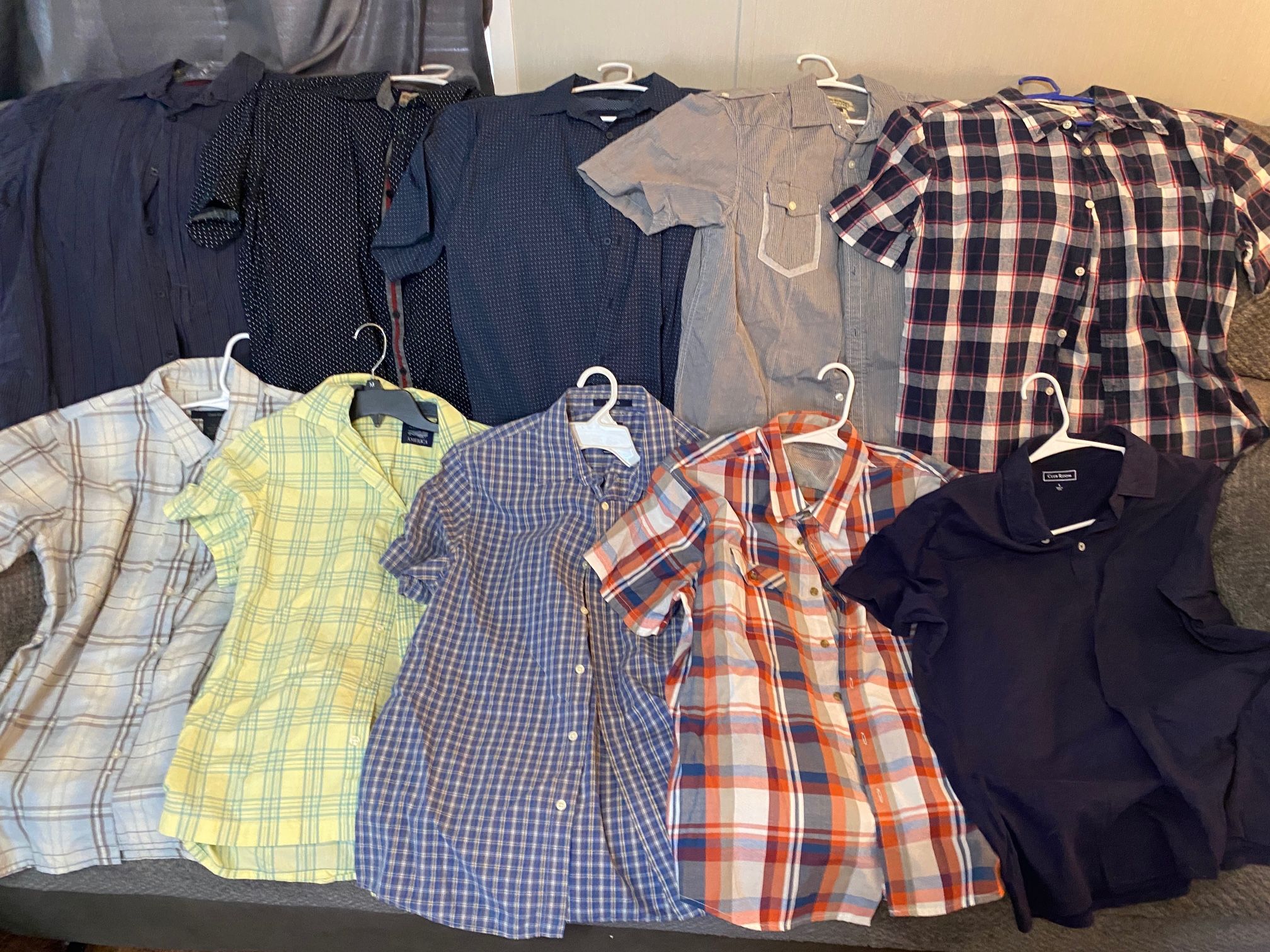 Men’s large shirts in excellent preowned condition. 17 total. 9-short sleeve button up, 1-short sleeve polo, 2-vests, 1-long sleeve polo, 2-long sleeve button up, 1-sweatshirt, & 1 turtleneck. $40 for all. Please feel free to ask any questions, thanks!!