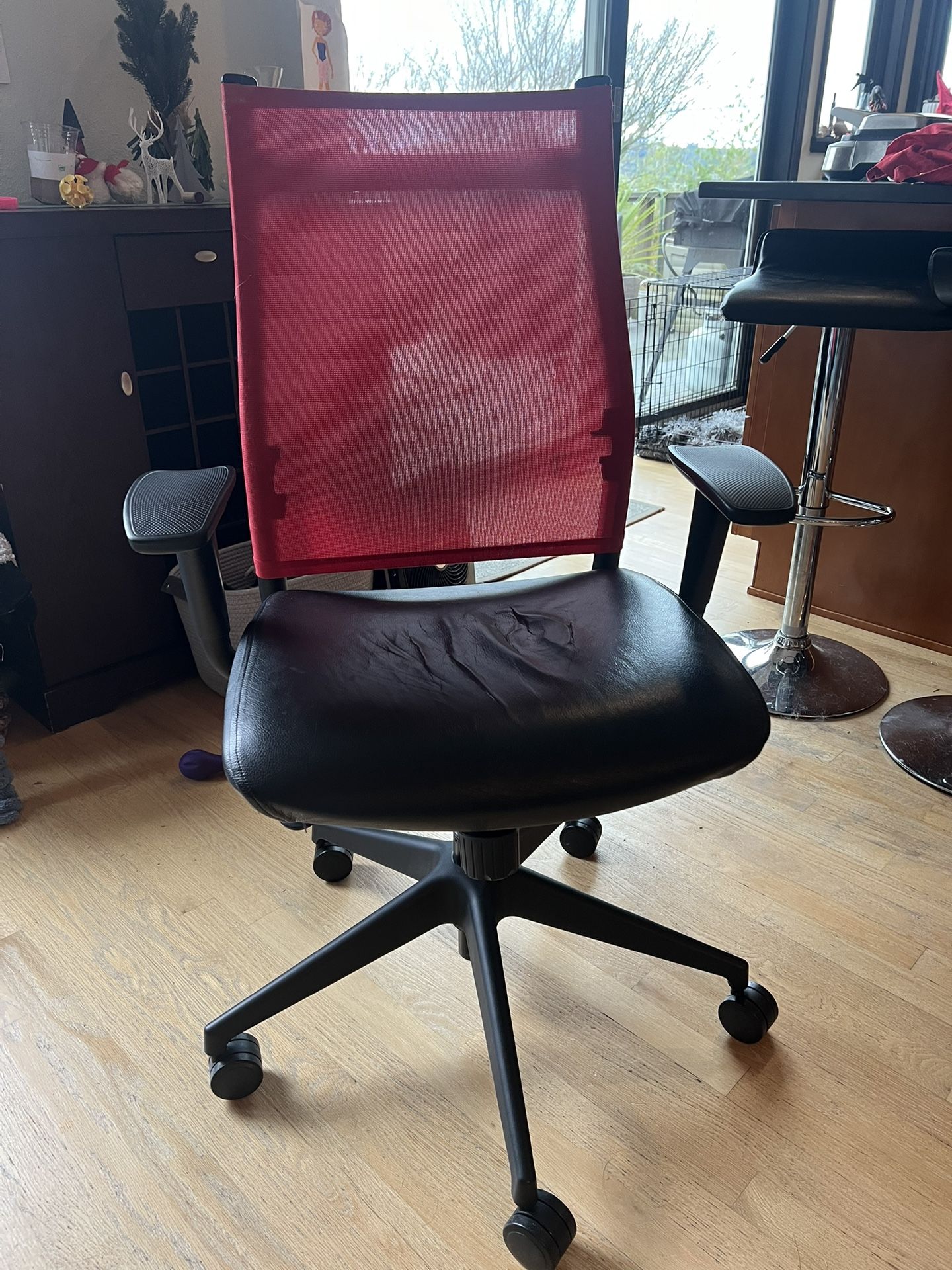 Free desk chair - great for wood floors. Adjustable height and back tilt. Mesh back, leather seat. Small chip out of right arm, strap along back broke off - all small cosmetic and still looks and works great overall.