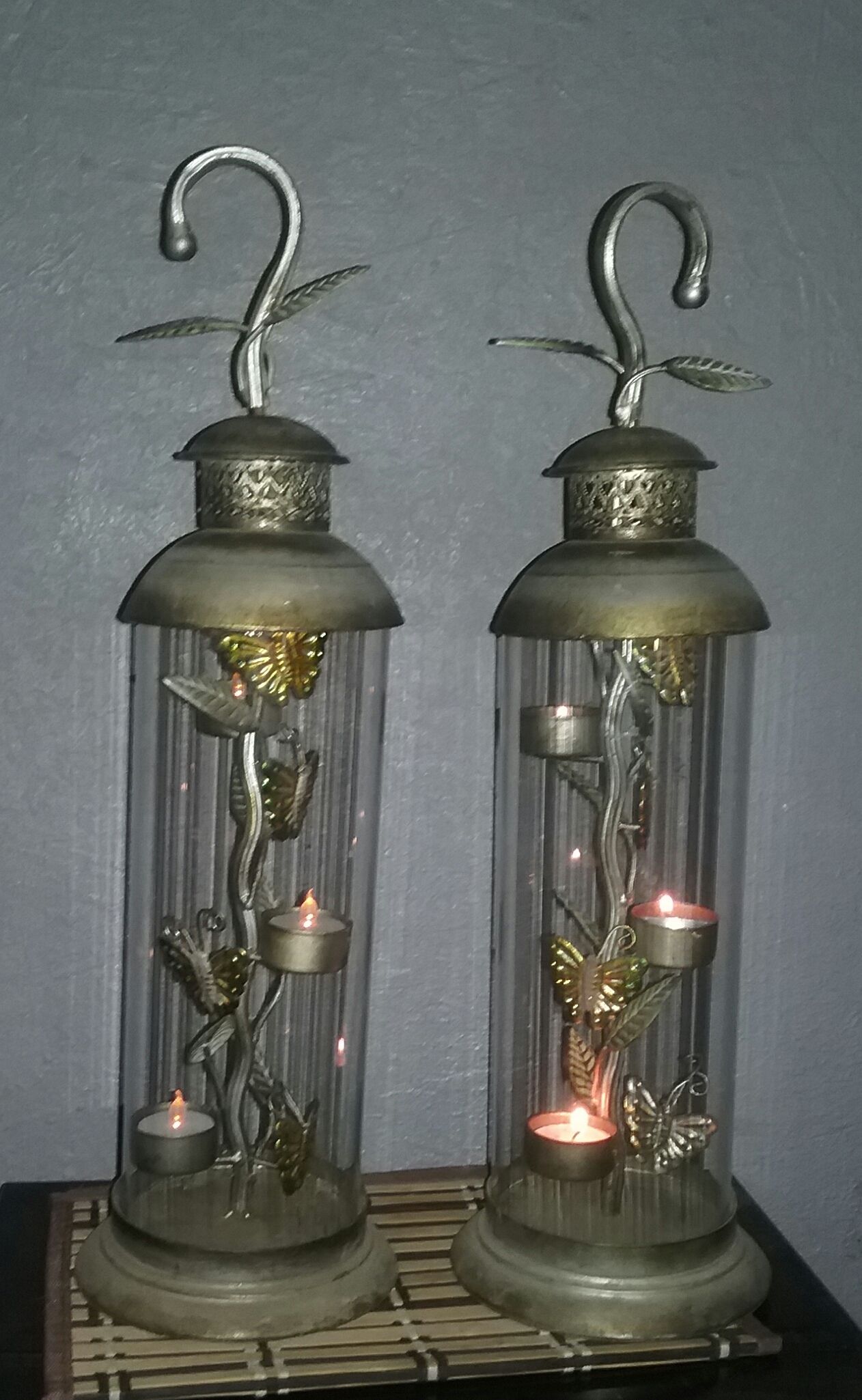 Set of tea lamps. Can be used with tea candles or lites. Comes with both 21" tall with removable 12" clear glass cylinders for easy cleaning and lite or candle change. Decorative vine & leaves with reflective colored butterflies. All hand cut and braised. Excellent condition Sold as set