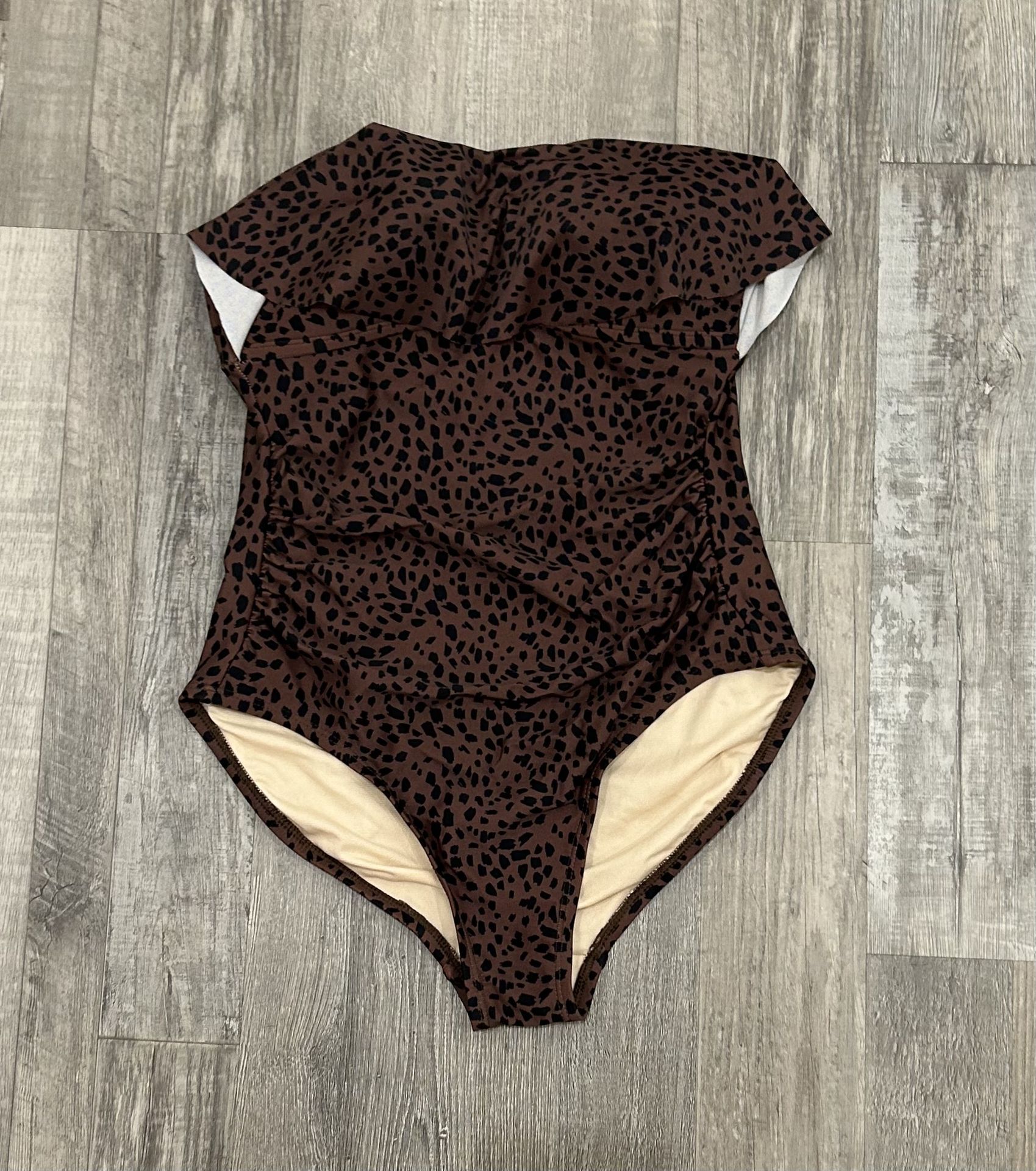 Kona Sol strapless swimsuit. Brown and black animal print. Ruffled chest overlay. Rubber inside chest to keep it from slipping. Ruched sides. Molded and passed cups. Size S. Approximate Measurements: Pit to pit - 12.5” Top of chest to bottom - 21” Nylon | Polyester | Spandex 23