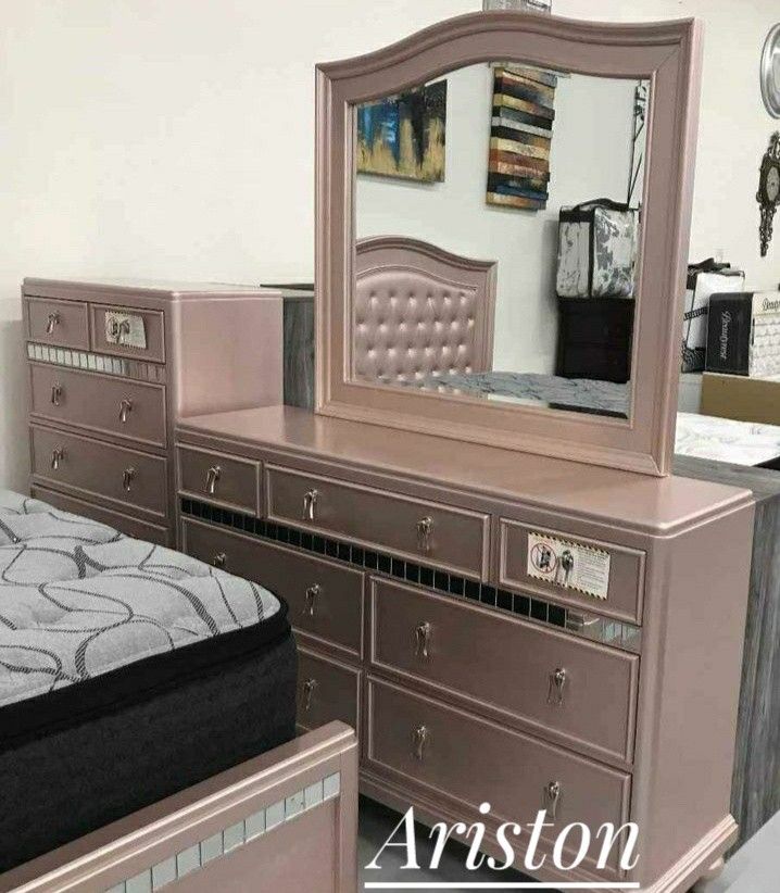 Pink Color Queen Bedroom Set Bed Frame, Dresser, Nightstand, Mirror 💛No Needed Credit Check 💛 $39 Down Payment with Financing0950