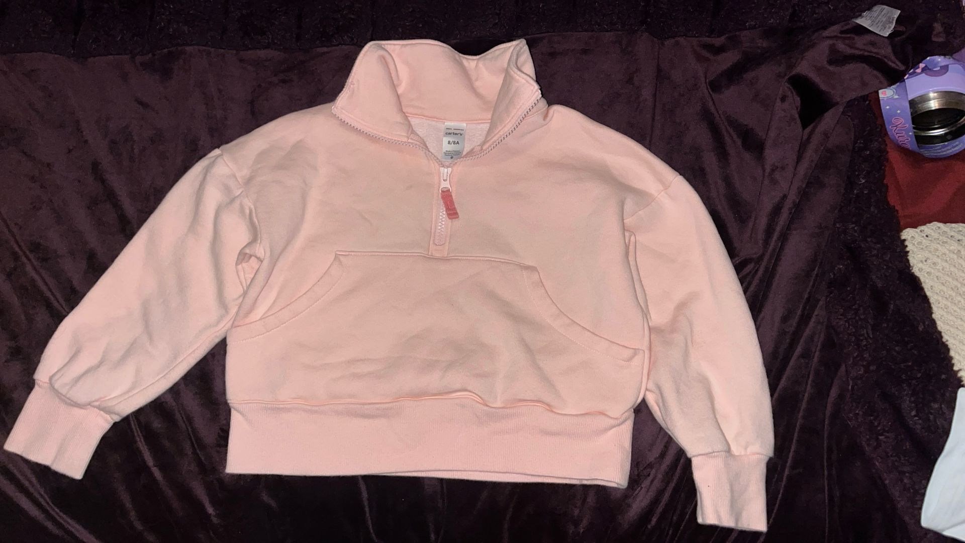 Cute pink fleece quarter zip up sweatshirt, goes up to the neck. For little girls Size 8/8A. There is a minor stain as shown in the last picture but not noticeable. $20. Look at more lovely affordable clothing on my page!