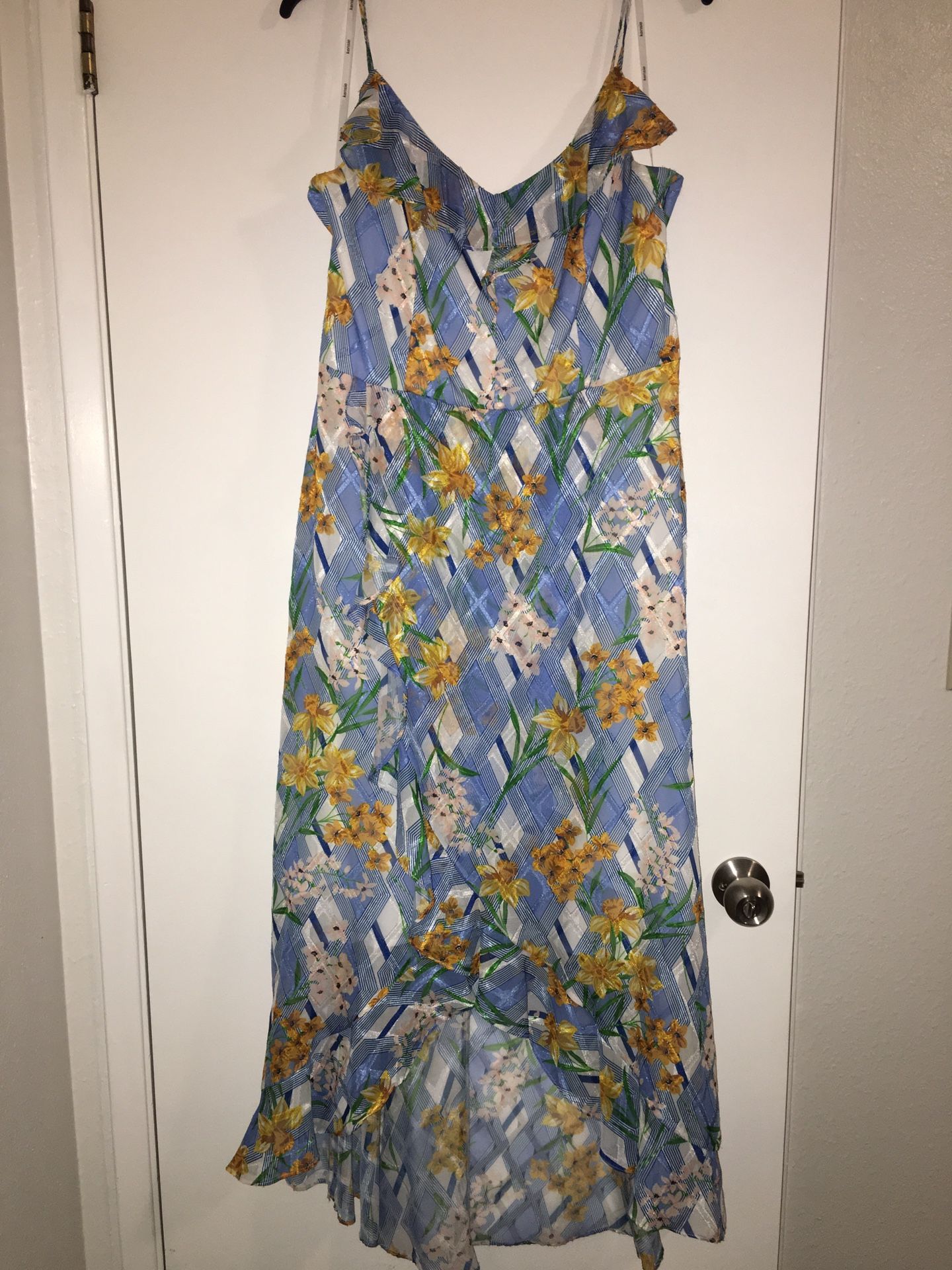 Size 12 beautiful blue yellow and light pink flower summery dress Tapered from the front and long on the back. Modesto near memorial medical hospital