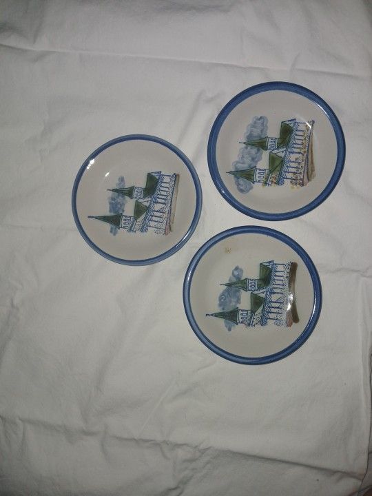 3 SMALL DESERT PLATES MADE BY LOUISVILLE STONEWARE. THE DESIGN FEATURES THE OFFICIAL LICENSE LOGO OF CHURCH HILL DOWNS "TWIN SPIRES " PART OF THE LOUISVILLE STONEWARE COLLECTION. CELEBRATING THE 117TH KENTUCKY DERBY. IM REDUCING THE PRICE FRO. $30.00 dollars TO $15.00 dollars!!! OR BEST OFFER!!!