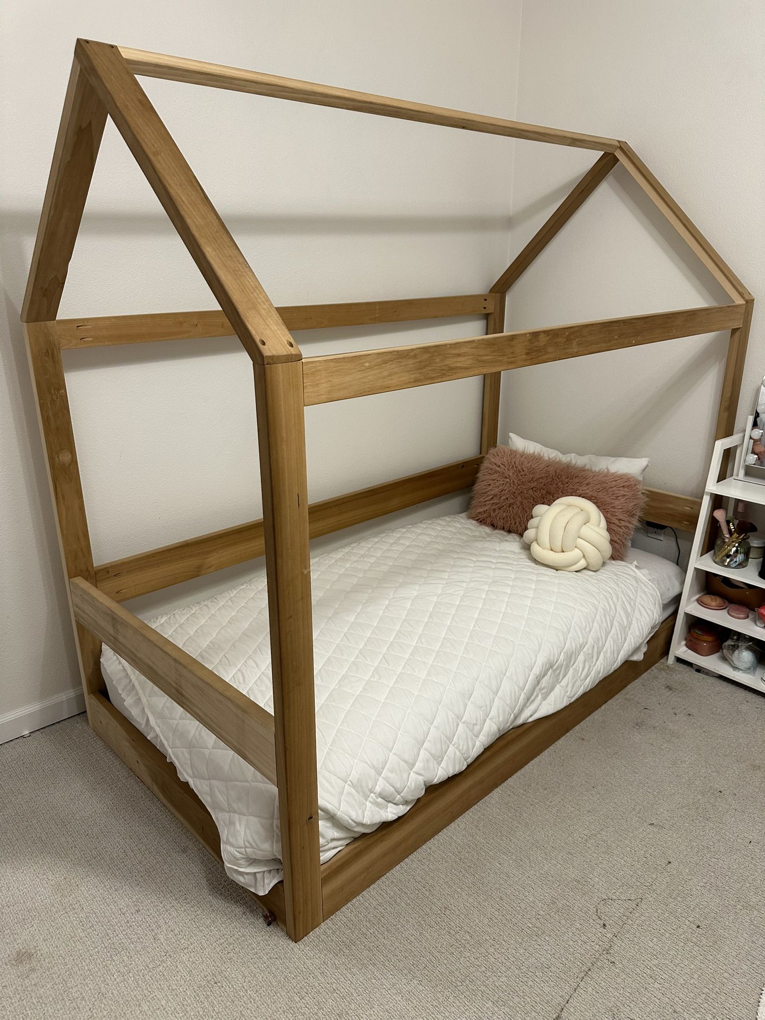 Solid wood twin size bed in great condition! Great condition and have two of them!
