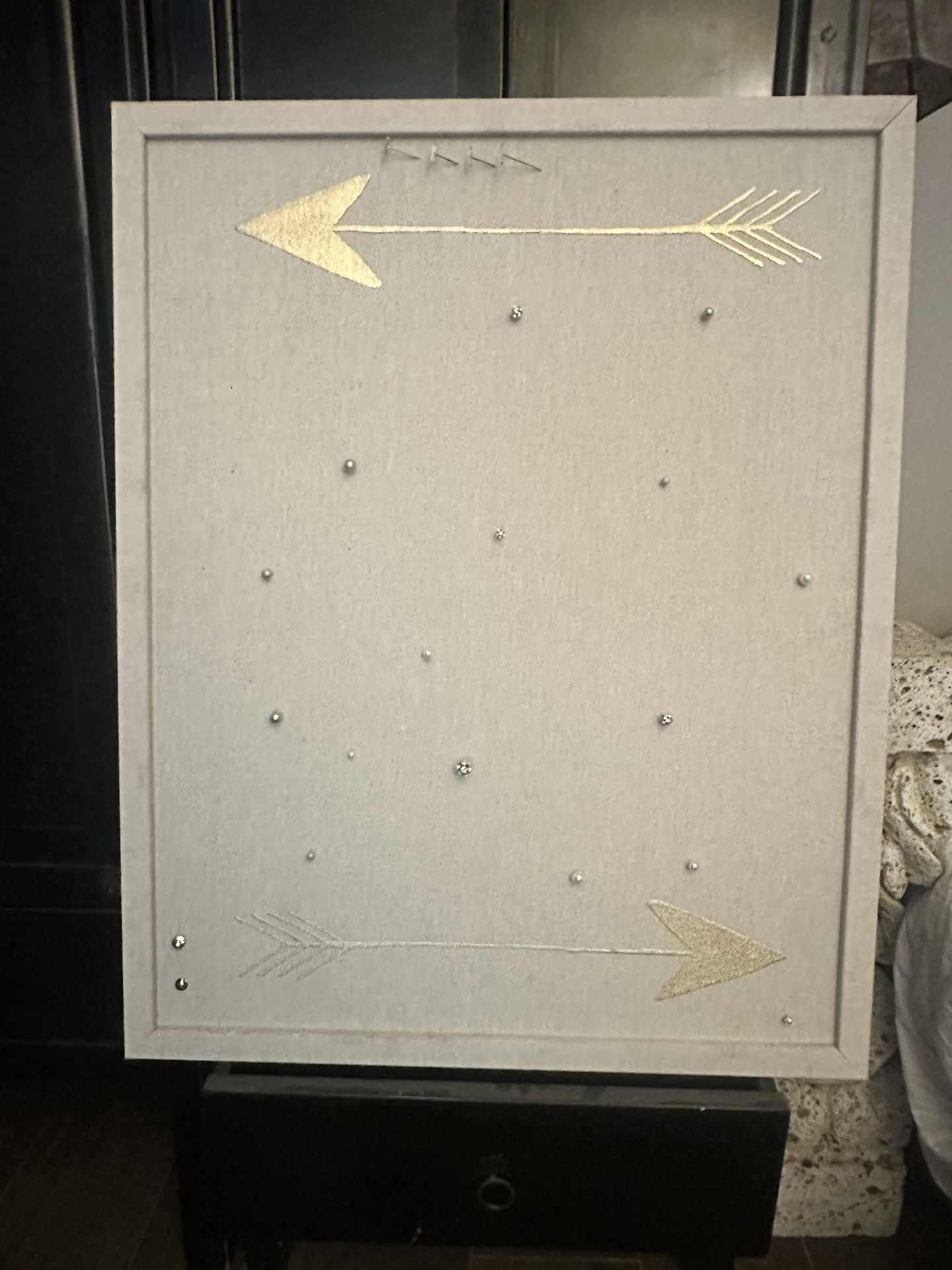 Bulletin board. Photo board. Memo board. Message board. White washed wood frame. Tan linen-covered inset with 16 pushpins. 29”x24”.