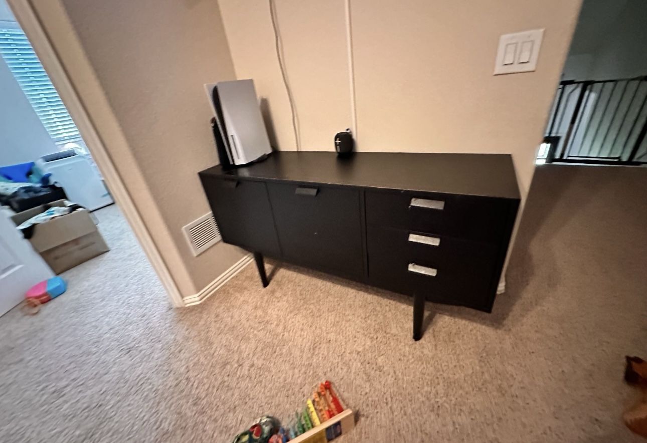 Large wood media stand with lots of storage space. Has a couple scratches but overall in great condition.