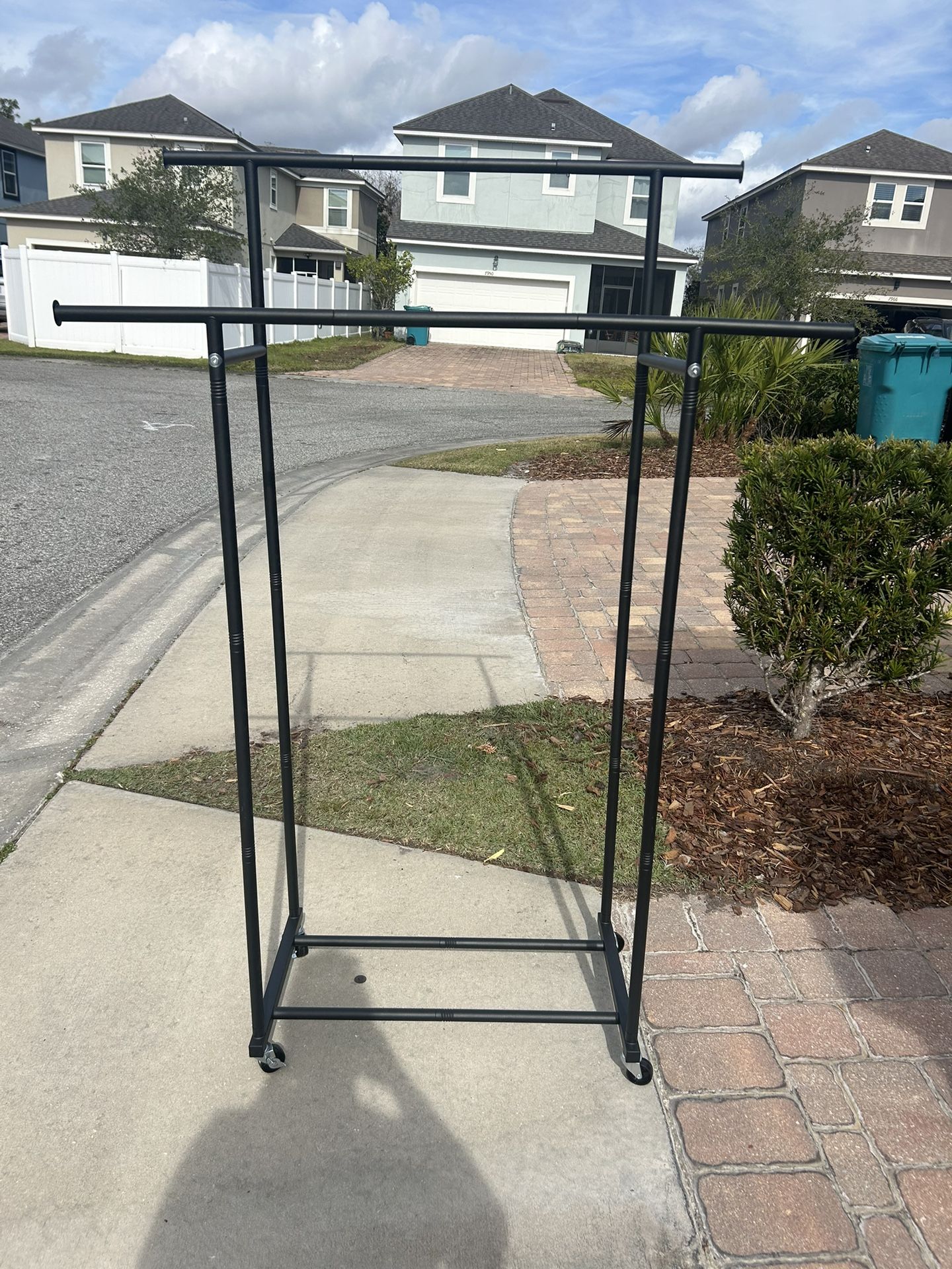 Black, metal double rod clothing organizer with locking wheels Great condition, pet free smoke free home Located in Lake Nona 32832